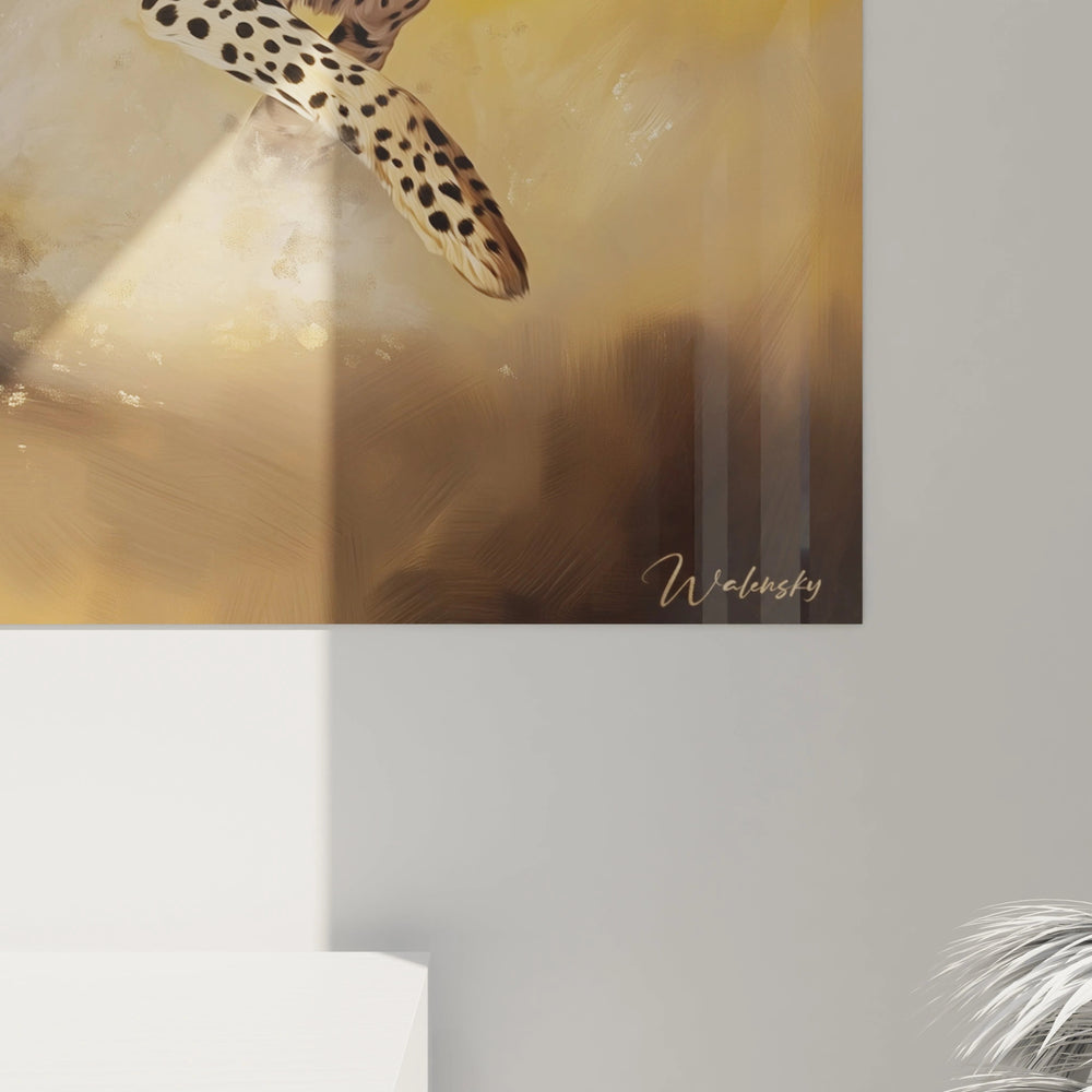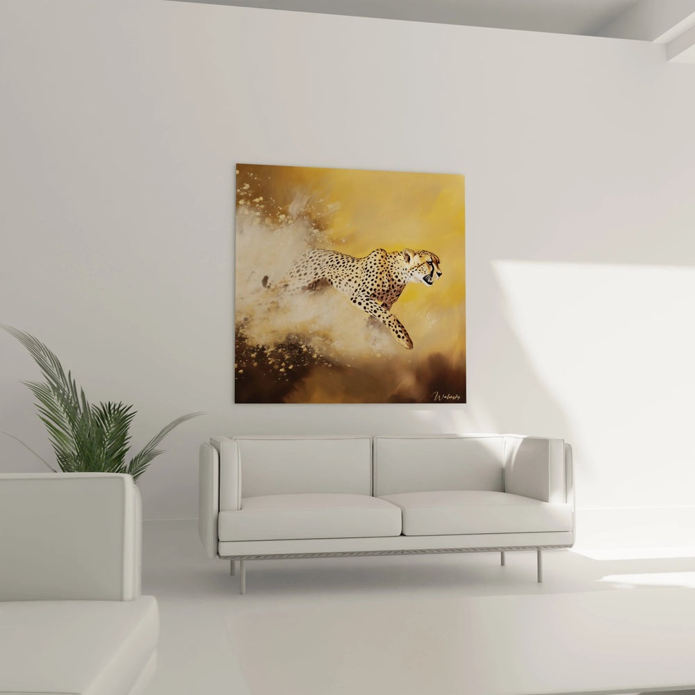 Ce tableau guépard capture l'essence même de la vitesse et de l'élégance sauvage. L'œuvre présente un guépard en pleine course, les muscles tendus et les pattes décollées du sol dans un élan de pure puissance. Les taches noires caractéristiques de ce félin se détachent magnifiquement sur son pelage fauve, créant un contraste saisissant avec l'arrière-plan doré. Cette décoration murale guépard exprime parfaitement l'énergie brute et la grâce naturelle de ce prédateur emblématique de la savane africaine. Les effets de poussière et les particules dorées qui entourent l'animal renforcent cette impression de mouvement dynamique et de vitesse fulgurante.