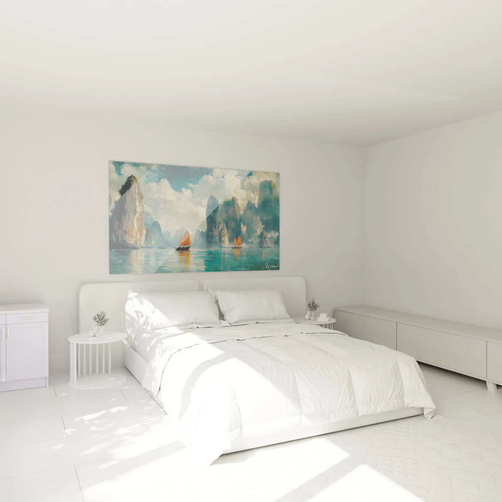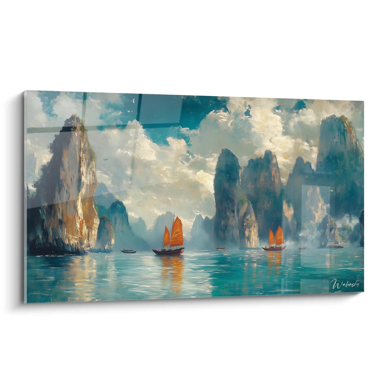 Ce tableau paysage marin captive instantanément par sa représentation saisissante de falaises karstiques majestueuses émergeant d'eaux turquoise cristallines. Les embarcations traditionnelles à voiles orangées naviguent sereinement entre ces géants de pierre, créant un contraste saisissant. Le jeu de lumière entre les nuages vaporeux et les reflets sur l'eau crée une atmosphère onirique unique. La composition grandiose offre une sensation d'immersion totale dans ce tableau paysage marin asiatique, où l'équilibre entre puissance minérale et délicatesse humaine évoque une sérénité profonde.