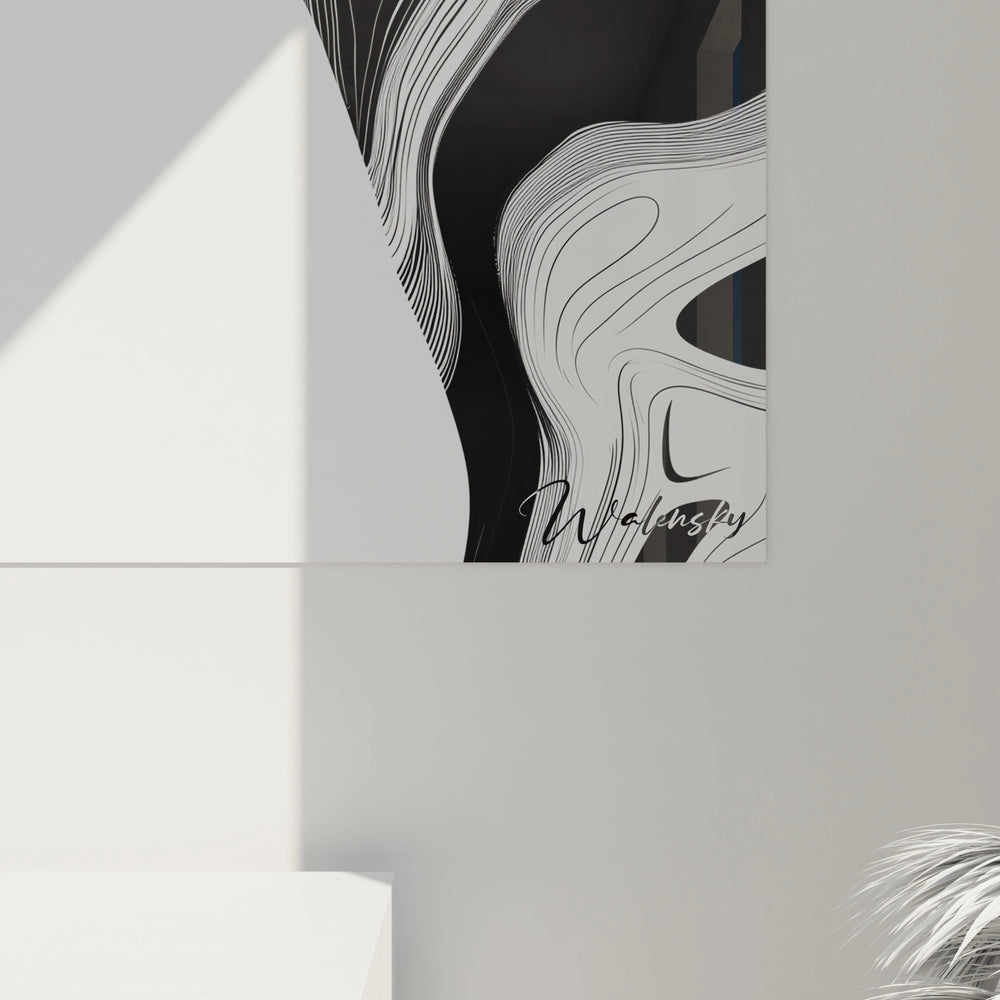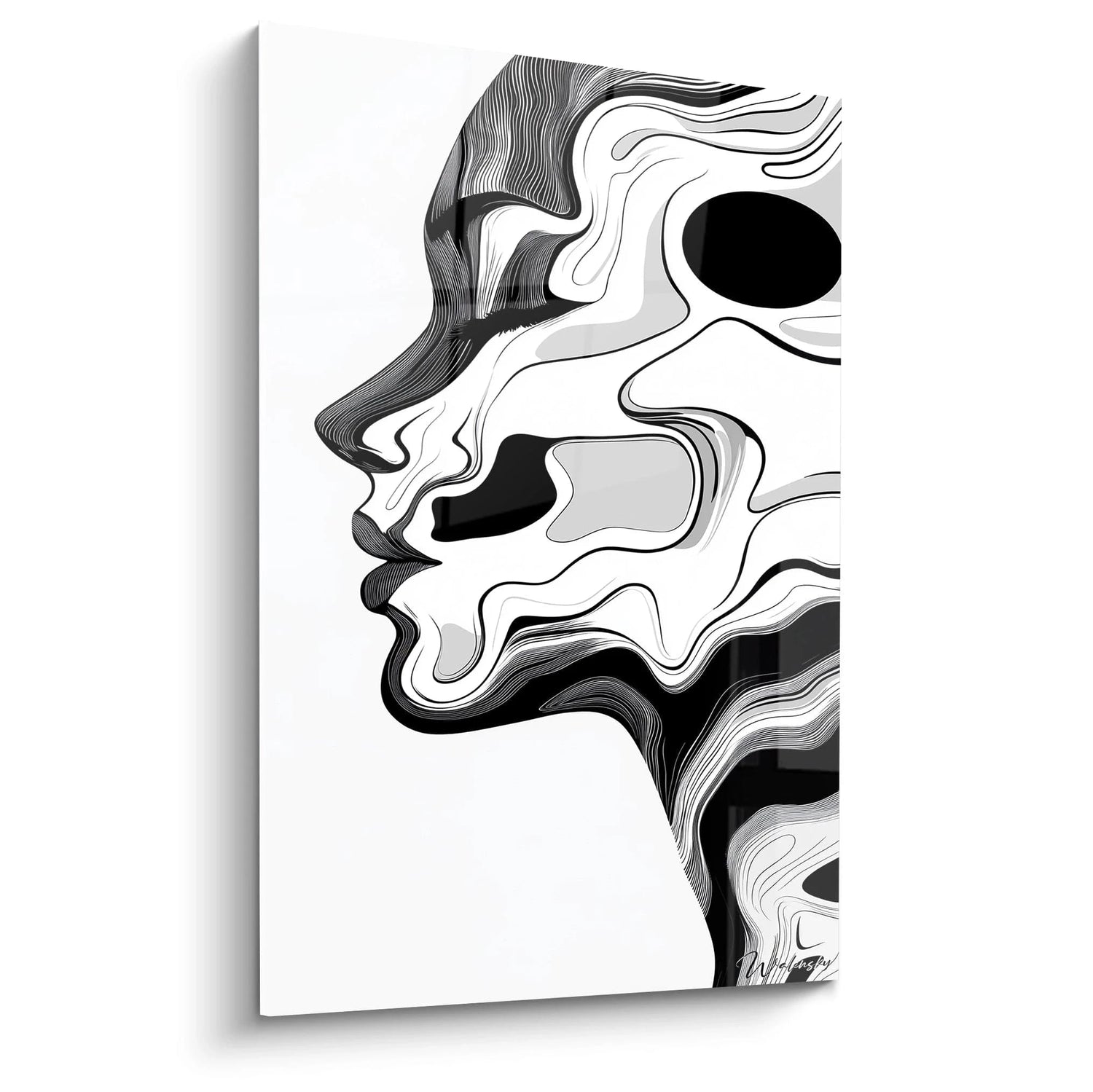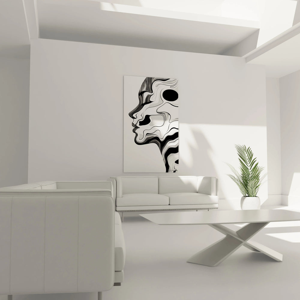 Ce tableau rayures noir et blanc captive immédiatement par sa composition minimaliste mais profondément expressive. L'œuvre présente un profil humain stylisé émergeant d'un assemblage fluide de lignes ondulantes qui créent un effet visuel saisissant. La silhouette se révèle progressivement au regard, oscillant entre apparition et dissolution dans un jeu graphique sophistiqué.