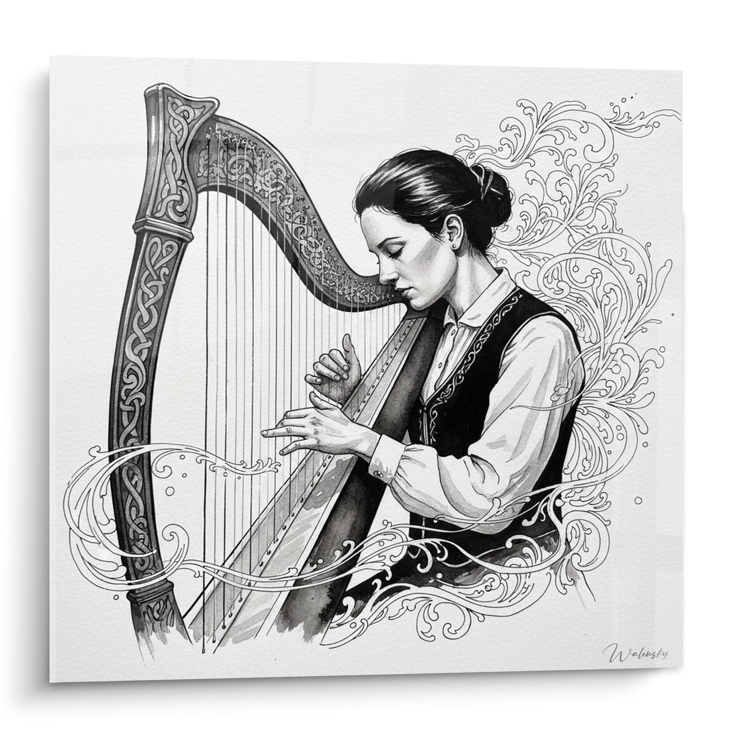 La composition présente un contraste saisissant entre les lignes droites des cordes de la harpe et les courbes gracieuses des motifs qui l'entourent. Les nuances de noir et de blanc apportent une profondeur visuelle, renforçant l'intensité de la connexion entre la musicienne et son instrument.