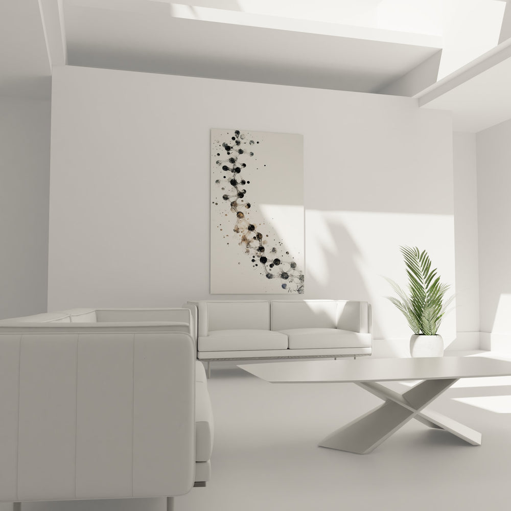 Ce tableau mural ADN présente une représentation artistique saisissante d'une double hélice ADN réalisée dans un style abstrait contemporain. L'œuvre se caractérise par une succession de cercles noirs et gris reliés par de fines lignes qui forment la structure hélicoïdale caractéristique de l'acide désoxyribonucléique. Cette décoration murale scientifique capture l'essence de la molécule de la vie à travers un prisme artistique moderne. Les différentes nuances de noir, du plus profond au gris clair, créent une profondeur visuelle remarquable sur fond blanc immaculé. Les points de connexion varient en taille et en intensité, certains apparaissant comme des éclaboussures d'encre, d'autres comme des cercles parfaitement définis. Cette art mural biologie transforme la complexité moléculaire en une composition esthétique accessible. La technique utilisée évoque l'aquarelle et l'encre de Chine, donnant un aspect organique à cette représentation de la structure génétique artistique. Le tableau ADN décoratif s'étend verticalement, mimant l'élongation naturelle de la molécule d'ADN. Cette œuvre constitue un parfait tableau science moderne pour les passionnés de biologie et les amateurs d'art contemporain.