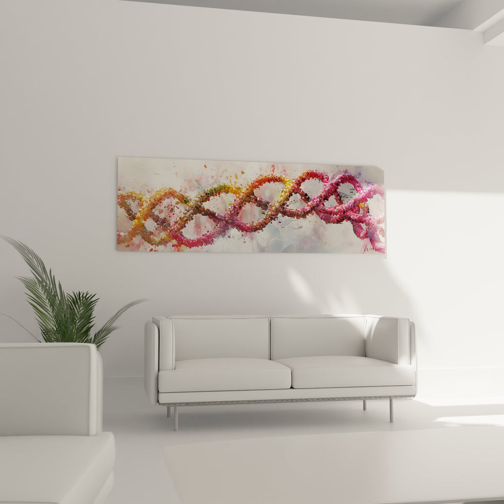 La palette chromatique de ce tableau ADN multicolore évoque la richesse et la complexité de la vie. Les tons roses, violets, jaunes et orangés se mélangent harmonieusement, symbolisant la diversité génétique et la beauté intrinsèque de notre code biologique. Cette œuvre d'art scientifique utilise les couleurs pour représenter l'énergie vitale qui circule dans chaque être vivant, transformant une molécule invisible en spectacle visuel saisissant.