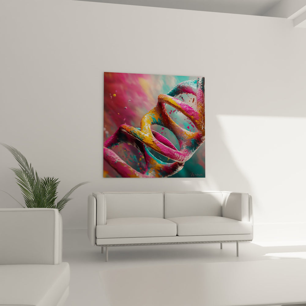 La symbolique ADN artistique de cette œuvre transcende la simple représentation scientifique pour devenir métaphore de la vie et de l'hérédité. Les couleurs vives - rose passion, turquoise énergique et orange dynamique - symbolisent la vitalité et la diversité génétique. Cette art génétique coloré évoque l'unicité de chaque être vivant tout en célébrant notre héritage commun. La luminosité chromatique reflète l'énergie créatrice contenue dans nos gènes.