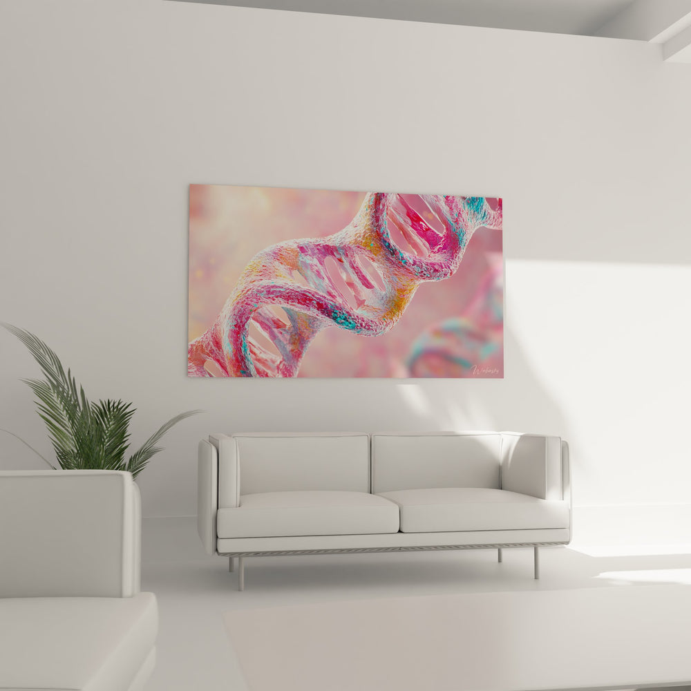 Tags : tableau ADN, hélice génétique, art scientifique, décoration biologie, tableau rose, art moléculaire, génétique artistique