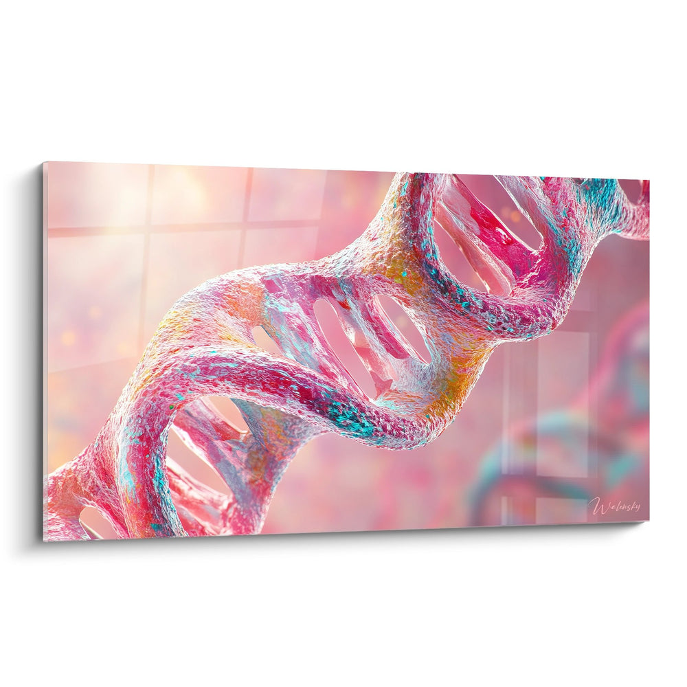 La palette chromatique de ce tableau ADN rose évoque la vie et la féminité à travers ses tons roses dominants, sublimés par des touches de turquoise et de blanc nacré. Ces couleurs symbolisent la douceur de la création et la complexité de la vie. Les nuances irisées rappellent la préciosité de notre patrimoine génétique, transformant cette œuvre scientifique décorative en hymne à la beauté du vivant.