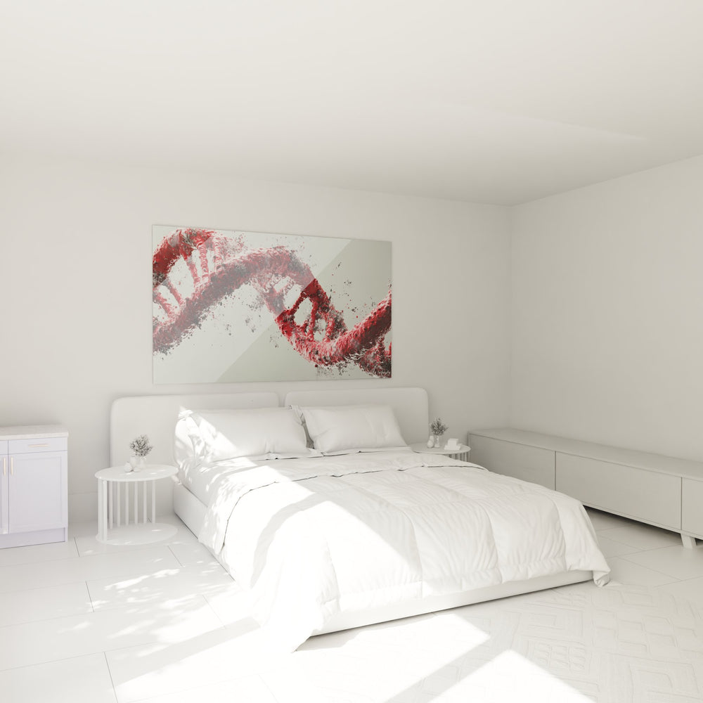 La dominante rouge de ce tableau ADN artistique évoque la vie, le sang et l'essence même de notre existence biologique. Cette palette chromatique intense symbolise la passion de la découverte scientifique et la puissance créatrice de l'ADN. Les nuances de rouge, du carmin au vermillon, créent une profondeur émotionnelle qui transcende la simple représentation scientifique pour toucher à l'universel humain.