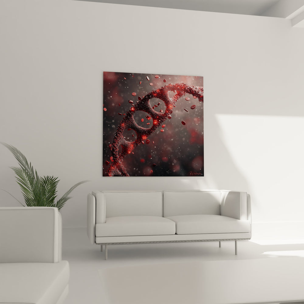 La dominante rouge de ce tableau génétique artistique évoque la vitalité, l'énergie et la passion de la recherche scientifique. Cette couleur intense symbolise le sang, porteur de notre patrimoine génétique, tout en créant une atmosphère dramatique et captivante. Les nuances de rouge, du cramoisi profond aux éclats lumineux, donnent vie à cette décoration murale ADN et renforcent son impact visuel exceptionnel.