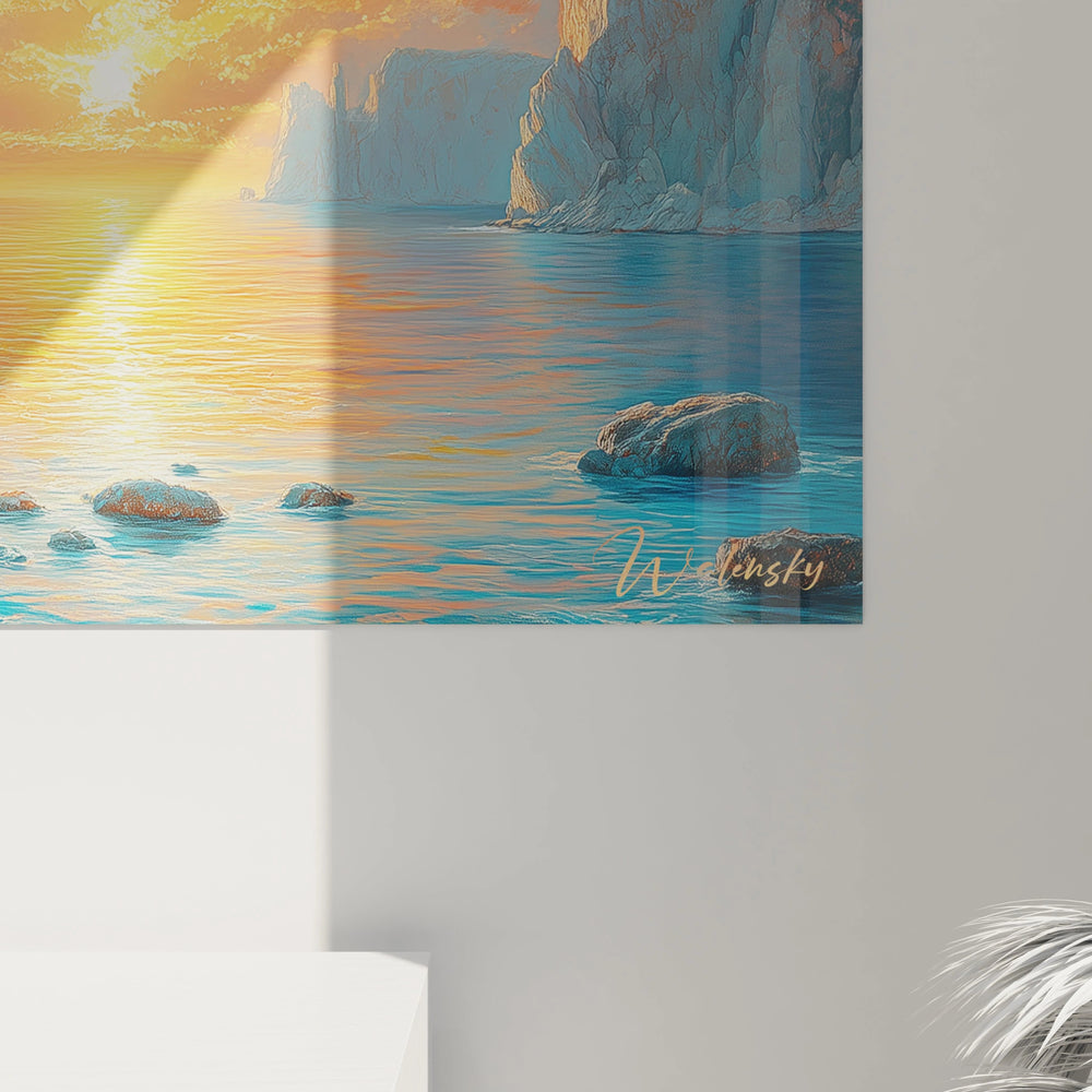 Imaginez les teintes chaleureuses de l’orange incandescent se mêlant subtilement aux reflets profonds du bleu des falaises, invitant vos sens à une immersion totale. Ce tableau transcende la simple décoration : il crée un sanctuaire de sérénité, un lieu de contemplation où le temps semble suspendu entre grandeur et mélancolie. Laissez cette harmonie lumineuse éveiller en vous une paix intérieure et un émerveillement renouvelé à chaque regard.