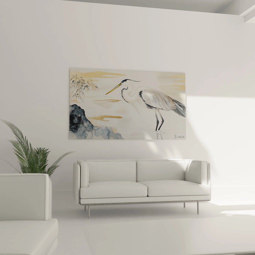 Cette décoration murale héron apaisante trouve sa place idéale dans des espaces dédiés à la détente et à la contemplation. Un salon aux tons neutres ou un bureau nécessitant une ambiance sereine constituent des environnements parfaits pour cette œuvre. L'éclairage naturel indirect révèle au mieux les subtilités chromatiques, particulièrement les reflets dorés qui animent la composition. Les couleurs douces s'harmonisent naturellement avec des tons beiges, gris perle ou vert d'eau. Cette art mural héron zen s'intègre parfaitement dans une décoration contemporaine épurée ou dans un style naturel privilégiant les matières brutes comme le bois et la pierre.