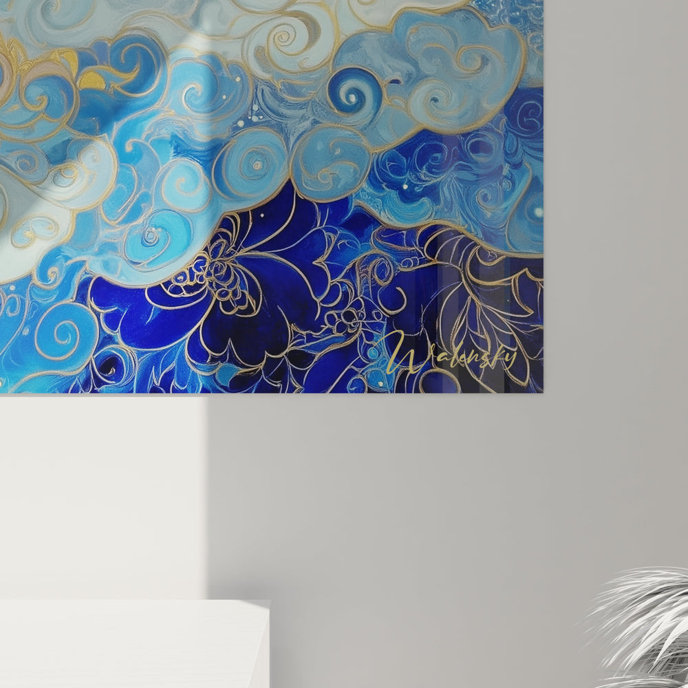 La palette chromatique dominée par les bleus profonds et les ors scintillants évoque la noblesse et la sérénité. Le héron, symbole de patience et de grâce dans de nombreuses cultures, est ici magnifié par ces tons dorés précieux qui lui confèrent une dimension spirituelle. Les nuances de bleu, du cobalt au turquoise, créent une profondeur atmosphérique rappelant les ciels orientaux.