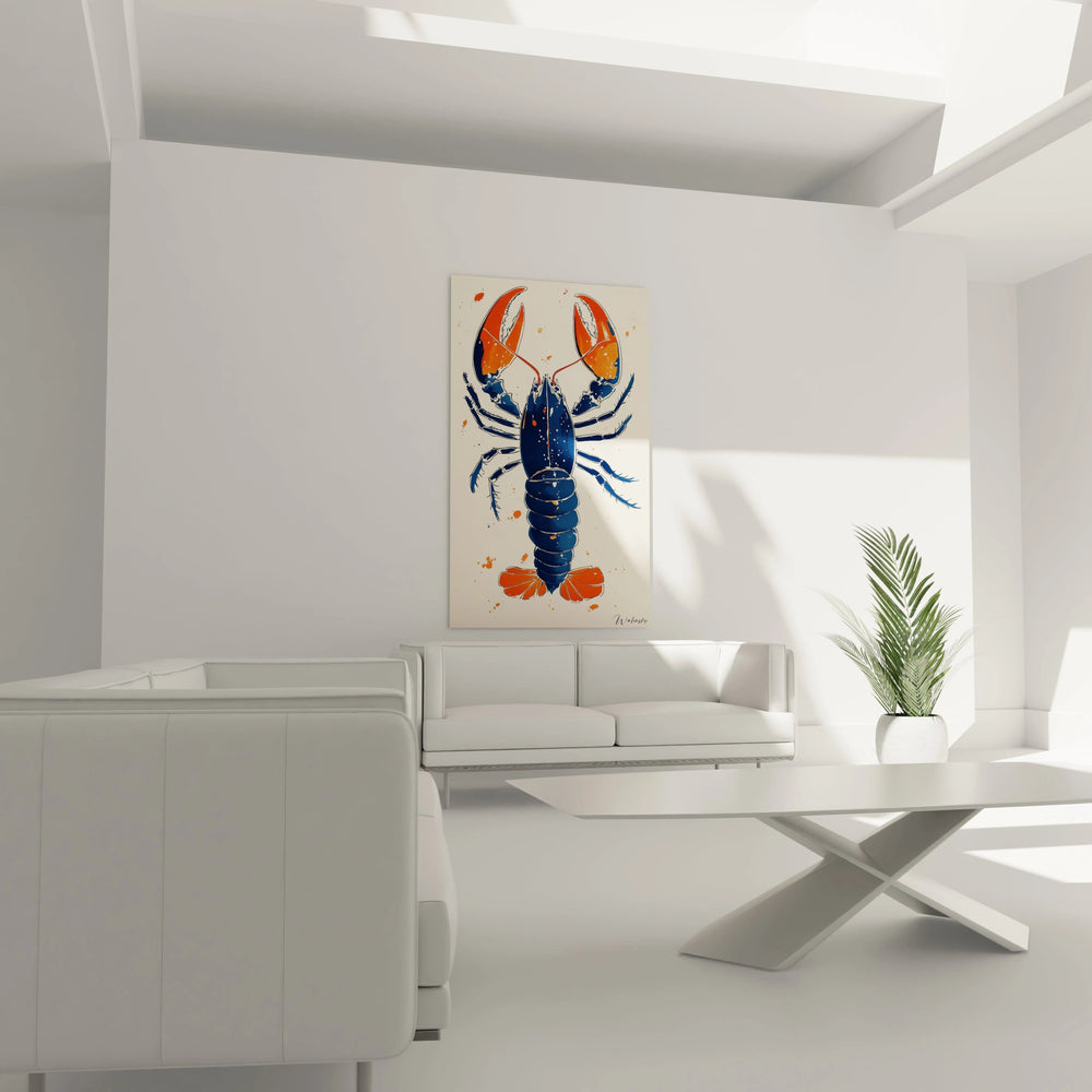 Imaginez la silhouette sculpturale du homard, ses pinces vibrantes d’énergie orange intense qui contrastent harmonieusement avec un bleu marine profond évoquant les abîmes enveloppants de l’océan. La douceur d’un fond beige délicat enveloppe l’ensemble, insufflant un souffle de sérénité tout en faisant éclater la vitalité du crustacé.