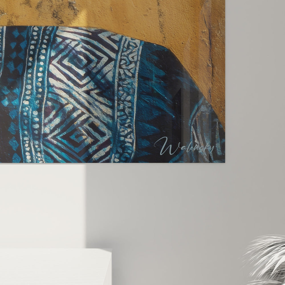 La palette chromatique de ce tableau privilégie les tons chauds ocre et dorés pour l'arrière-plan, contrastant harmonieusement avec les nuances bleues profondes du vêtement traditionnel. Ces couleurs symbolisent la terre africaine et le ciel infini, créant une atmosphère à la fois terrestre et spirituelle. Les motifs géométriques du tissu traditionnel ajoutent une dimension culturelle authentique à l'ensemble.