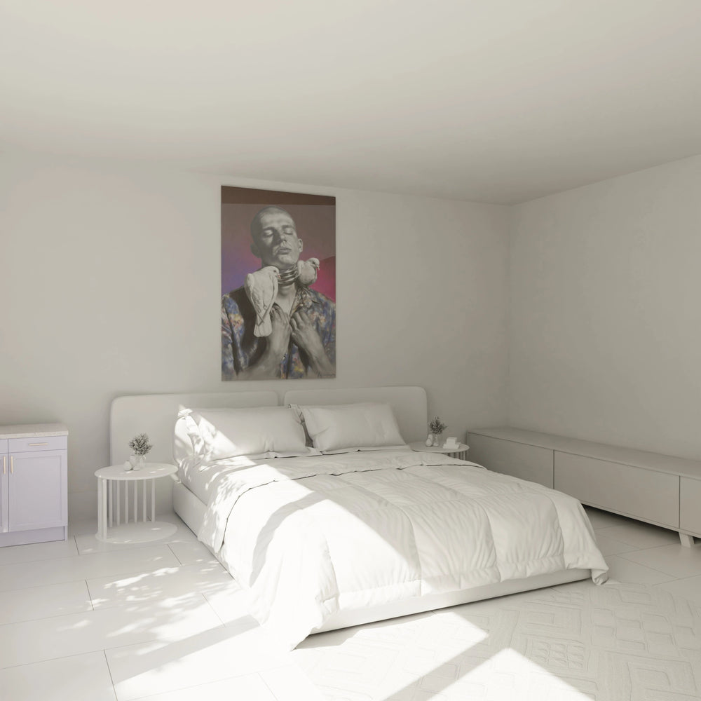 Ce tableau homme aux colombes présente une œuvre d'art contemporaine saisissante où un personnage masculin au crâne rasé apparaît dans une posture méditative, les yeux clos, tenant délicatement deux colombes blanches. L'expression sereine du visage contraste magnifiquement avec l'intensité du fond dégradé violet-rose. Cette décoration murale homme spirituel révèle immédiatement son caractère contemplatif et symbolique. Le collier métallique doré qui orne le cou du personnage ajoute une dimension mystique à l'ensemble. Les détails hyperréalistes des plumes des oiseaux et la texture de la peau créent une profondeur visuelle remarquable, faisant de ce tableau homme méditatif colombes une pièce d'exception.