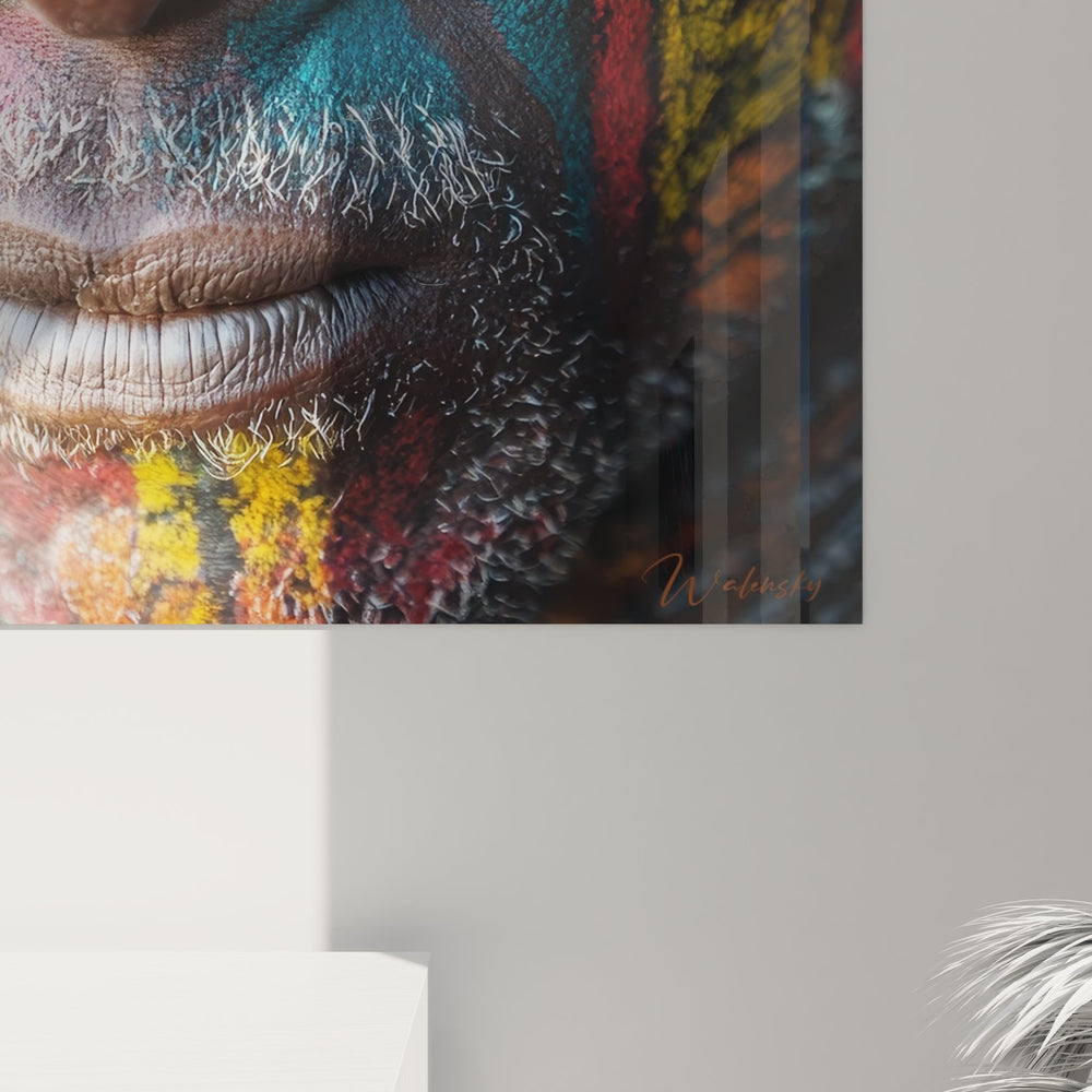 Ce tableau mural visage africain présente un portrait saisissant d'un homme arborant des peintures tribales colorées traditionnelles. L'œuvre capture l'intensité du regard à travers des yeux expressifs qui transpercent l'âme du spectateur, témoignant de la richesse de l'art africain contemporain. Les motifs géométriques traditionnels ornent harmonieusement le visage, créant un jeu de formes et de couleurs qui révèle l'identité culturelle profonde du sujet. Cette décoration murale ethnique met en valeur la beauté des traditions ancestrales à travers un prisme artistique moderne. Le tableau portrait africain se distingue par sa technique de peinture corporelle authentique, où chaque trait raconte une histoire millénaire. La barbe grisonnante du personnage apporte une dimension de sagesse et d'expérience, contrastant magnifiquement avec la vivacité des couleurs appliquées sur son visage. Cette œuvre d'art murale africaine transcende la simple représentation pour devenir un véritable hymne à la diversité culturelle et à l'héritage artistique du continent africain, offrant une expérience visuelle immersive et émotionnellement chargée.