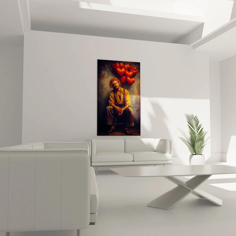 Ce tableau homme ballons cœur révèle une composition artistique d'une intensité émotionnelle remarquable. L'œuvre présente un personnage masculin aux cheveux roux bouclés, assis dans une posture contemplative, tenant un bouquet de ballons en forme de cœur rouge éclatant. Cette décoration murale homme romantique capture parfaitement l'essence de la vulnérabilité masculine face aux sentiments amoureux. Les tonalités dorées et cuivrées du personnage contrastent magnifiquement avec l'éclat rouge vibrant des ballons, créant une harmonie visuelle saisissante. L'arrière-plan aux nuances grises et brunes apporte une profondeur dramatique à l'ensemble, faisant de ce tableau homme ballons rouge passion une pièce artistique captivante.