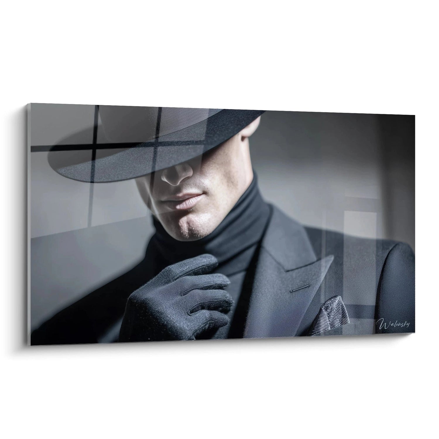 Ce tableau mural beauté masculine capture l'essence de l'élégance masculine à travers un portrait artistique d'une sophistication remarquable. L'œuvre présente un homme mystérieux dont le visage est partiellement dissimulé par l'ombre d'un chapeau à large bord, créant une aura d'intrigue et de raffinement. Le personnage arbore un costume trois-pièces impeccablement taillé dans les tons sombres, complété par des gants assortis et une pochette de costume aux motifs délicats. Cette composition en noir et blanc évoque l'âge d'or du cinéma et la photographie artistique des années 1940-1950.