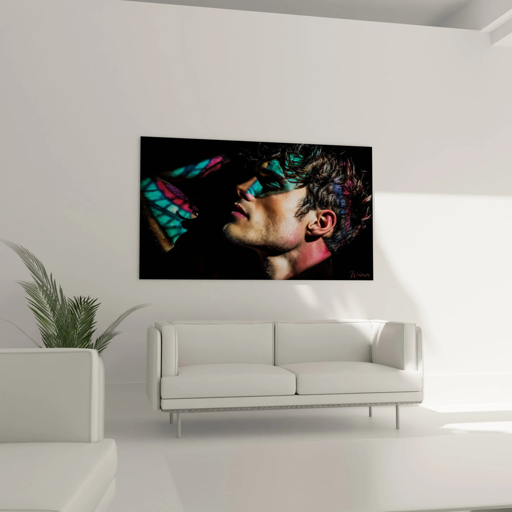 Les couleurs dominantes de ce tableau décoratif homme véhiculent une symbolique riche et contrastée. Le turquoise évoque la spiritualité et la communication, suggérant une ouverture d'esprit et une profondeur émotionnelle. Le magenta, couleur de la créativité et de la passion, ajoute une dimension artistique et sensuelle à l'ensemble. Les nuances violettes renforcent cette atmosphère mystérieuse, associées traditionnellement à la transformation et à l'introspection. Cette palette chromatique néon contraste volontairement avec la masculinité classique, proposant une vision moderne et décomplexée de la beauté masculine artistique. L'harmonie entre ces teintes froides et chaudes crée un équilibre visuel parfait qui capte immédiatement l'attention.