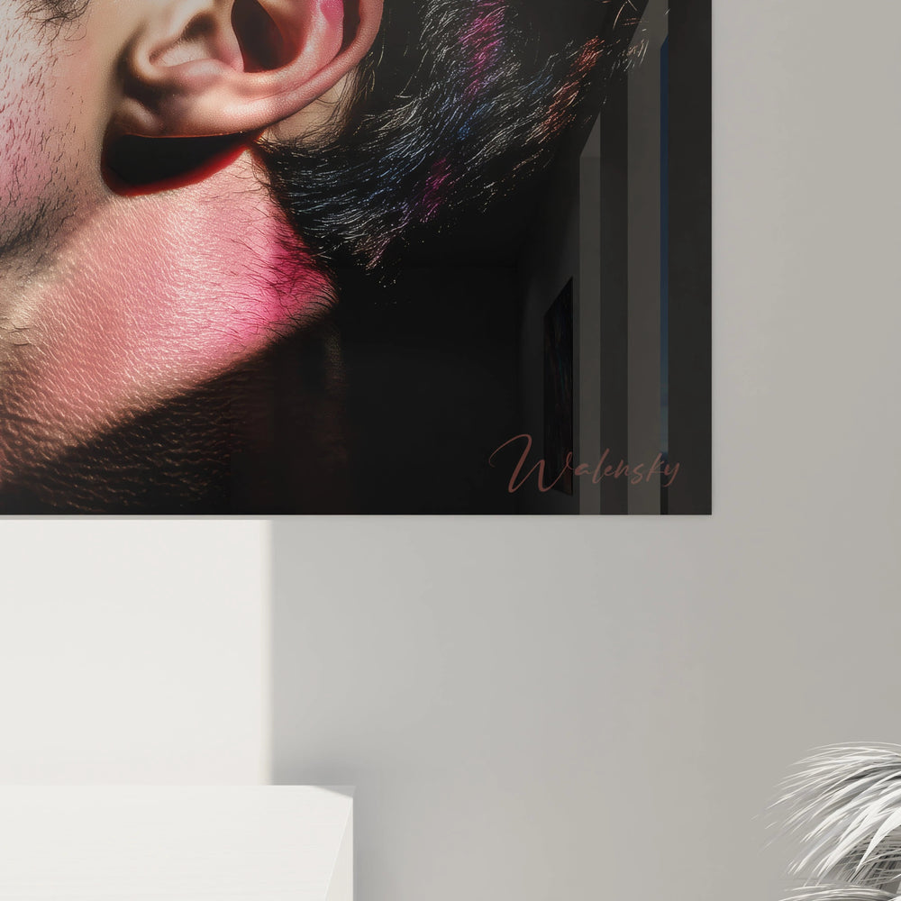 Ce tableau mural beauté masculine présente un portrait masculin d'une intensité visuelle remarquable, où l'art de l'éclairage coloré transforme une simple photographie en œuvre d'art contemporaine. Le modèle, un homme aux traits fins et à la barbe naissante, arbore une expression contemplative qui évoque la sérénité et la profondeur. Ses cheveux bruns ondulés encadrent harmonieusement son visage sculptural, tandis que son regard dirigé vers le haut suggère une quête spirituelle ou artistique. L'élément le plus saisissant de cette composition réside dans le jeu de lumières colorées néon qui baigne l'ensemble du portrait. Des teintes turquoise électrique, magenta vibrant et violettes profondes se projettent sur la peau du modèle, créant des reflets chatoyants qui subliment sa masculinité contemporaine. Ces projections lumineuses, loin d'être anarchiques, suivent les courbes naturelles du visage et du cou, accentuant la musculature et les reliefs. L'arrière-plan volontairement sombre fait ressortir ces couleurs avec une intensité dramatique, rappelant l'esthétique des années 80 revisitée par l'art contemporain masculin. Cette technique d'éclairage sophistiquée transforme le portrait traditionnel en une déclaration artistique moderne, où chaque nuance colorée raconte une histoire différente de la beauté virile moderne.