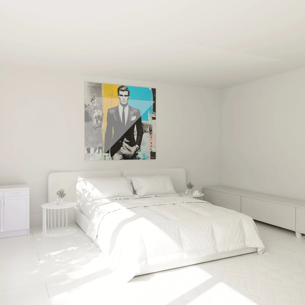 Cette création s'inscrit dans la lignée du mouvement pop art initié par Andy Warhol, particulièrement ses portraits de célébrités aux couleurs saturées. On retrouve également l'influence du street art contemporain de Shepard Fairey, notamment dans l'utilisation des contrastes et des superpositions graphiques. L'esthétique rappelle les collages de Robert Rauschenberg et la technique mixte de David Hockney. L'approche du portrait masculin artistique évoque aussi les photographies de mode de Richard Avedon, avec cette capacité à capter l'essence du style masculin. Cette œuvre décorative murale dialogue avec l'art urbain contemporain tout en puisant dans l'héritage du portrait classique.