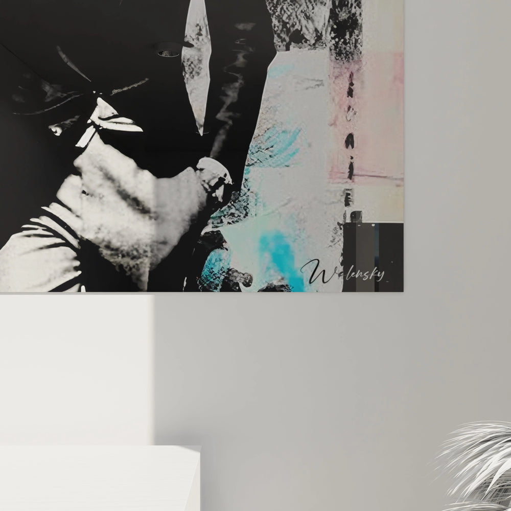 Cette œuvre murale décorative capture parfaitement l'essence du style masculin intemporel tout en l'ancrant dans une modernité artistique audacieuse. La juxtaposition entre l'élégance classique du costume et l'environnement graphique urbain crée une tension visuelle captivante qui interroge les codes de la masculinité contemporaine artistique.