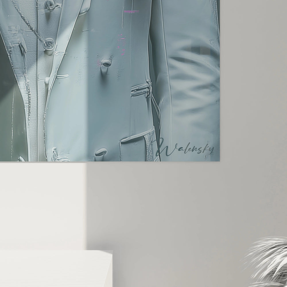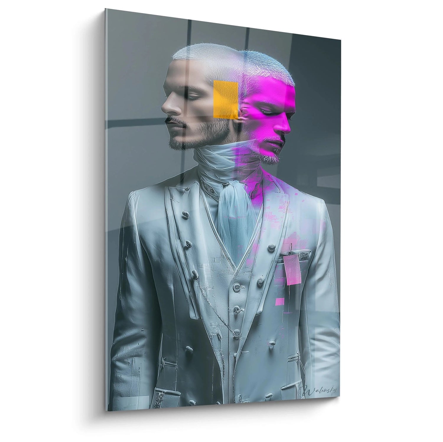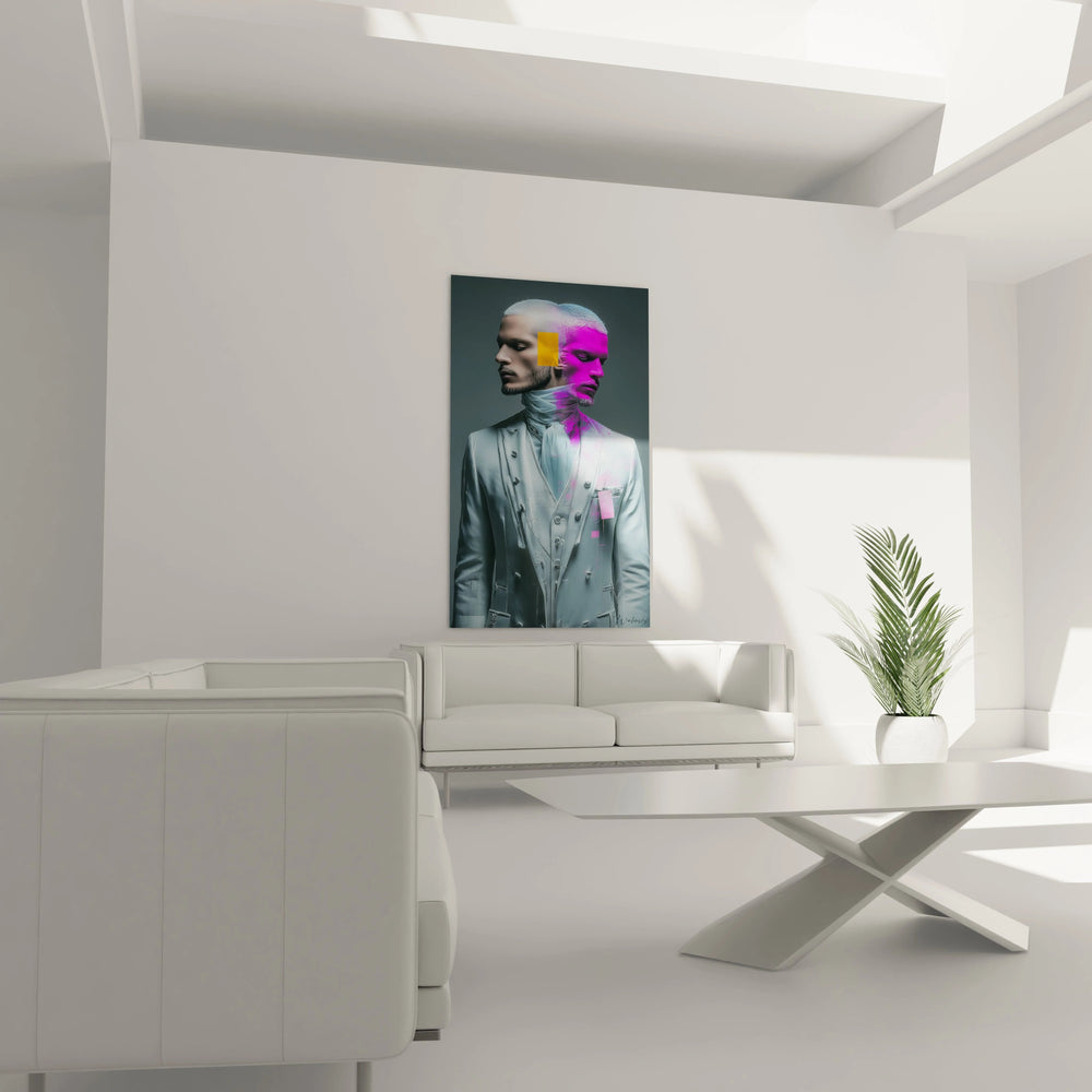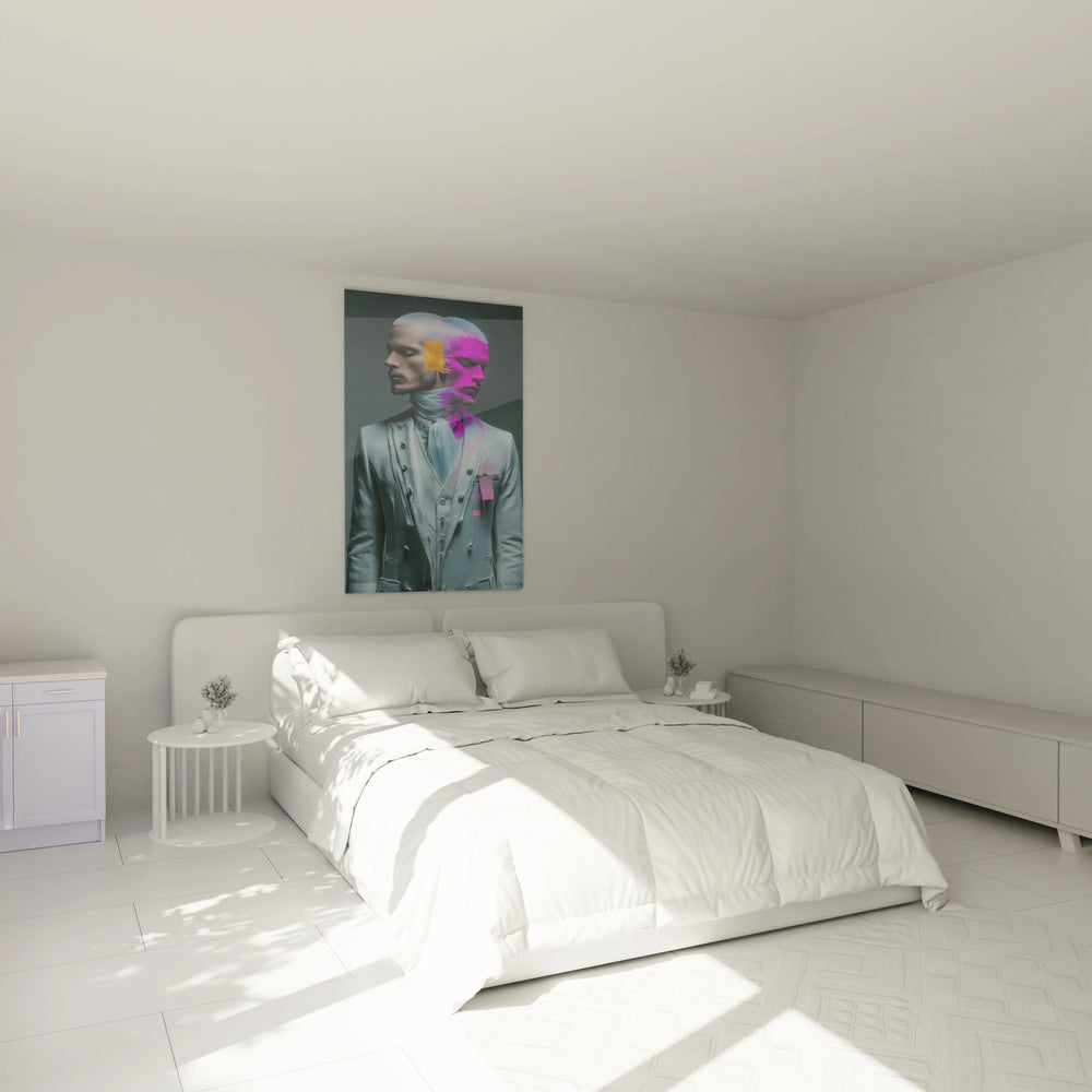 Ce tableau mural beauté masculine représente un portrait masculin d'exception, mêlant avec brio l'art contemporain et l'esthétique classique. L'œuvre présente un homme distingué arborant une barbe parfaitement taillée et vêtu d'un costume trois-pièces gris sophistiqué, rappelant l'élégance victorienne. Le traitement artistique unique divise le visage en deux univers chromatiques : tandis que la partie gauche conserve des tonalités naturelles et réalistes, la droite s'embrase d'un rose magenta électrique qui se propage dans la chevelure, créant un effet visuel saisissant. Un rectangle orange vif positionné sur le front accentue cette dualité artistique et apporte une touche de modernité audacieuse. Le costume lui-même intègre subtilement cette palette colorimétrique avec des accents roses sur le carré de poche, unifiant l'ensemble de la composition. Cette représentation artistique masculine transcende les codes traditionnels du portrait masculin pour proposer une vision contemporaine de la beauté masculine moderne, où sophistication vestimentaire et innovation chromatique se rencontrent harmonieusement. L'arrière-plan neutre met parfaitement en valeur cette figure hybride, symbolisant la rencontre entre tradition et modernité dans l'art mural contemporain.