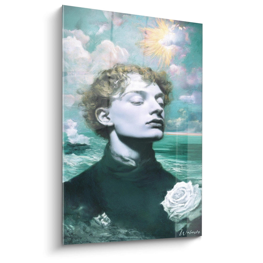 Ce tableau portrait masculin présente un jeune homme aux traits délicats et mélancoliques, capturé dans un moment de contemplation profonde. L'œuvre se distingue par son atmosphère romantique exceptionnelle, où les éléments naturels - ciel turquoise, soleil radieux et océan - créent un environnement poétique autour du personnage central. Le tableau portrait contemplatif révèle immédiatement sa nature introspective par le regard dirigé vers le haut et les yeux mi-clos du sujet. Les cheveux bouclés châtain clair encadrent harmonieusement un visage aux traits fins, tandis qu'une rose blanche délicate apparaît dans la composition, symbole de pureté et d'innocence. Cette décoration murale portrait évoque instantanément l'esthétique des maîtres romantiques par ses coloris subtils et son traitement poétique de la lumière.