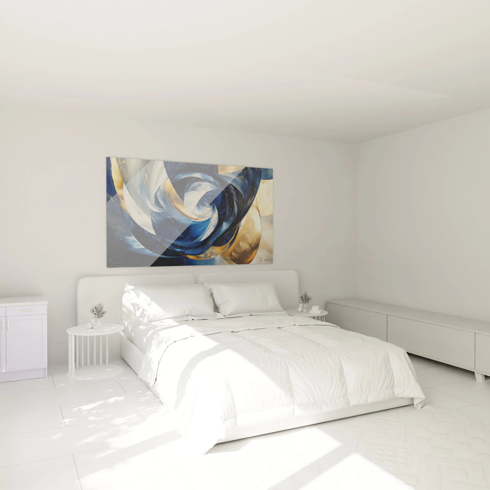 La palette chromatique de ce tableau spirale abstrait s'articule autour d'un trio puissant et évocateur. Le bleu domine dans toutes ses nuances, du marine profond au bleu ciel lumineux, traversant l'œuvre comme un courant aquatique. Cette teinte principale dialogue avec des touches d'un blanc nacré qui apporte luminosité et contraste, ainsi qu'avec des accents dorés chatoyants qui enrichissent la composition.