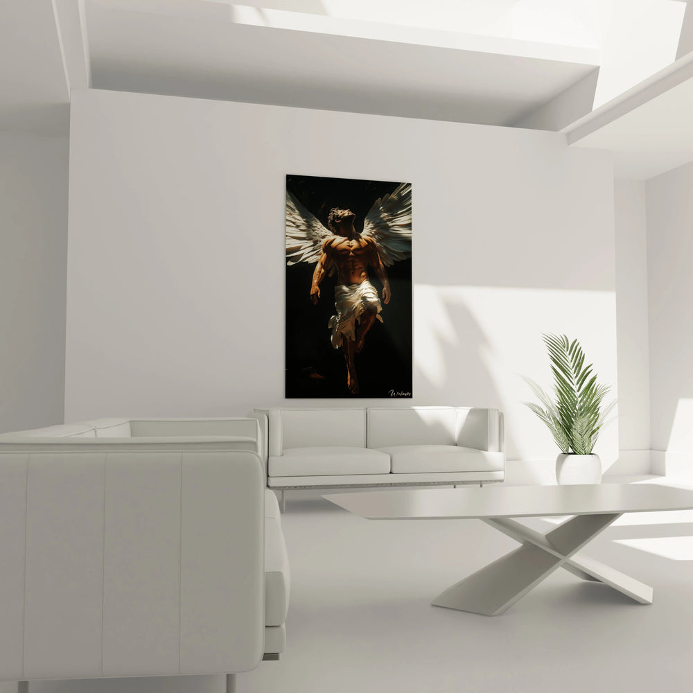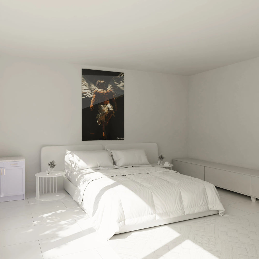 Ce tableau s’impose comme une fenêtre vers l’audace intemporelle d'Icare, cet être qui défia le soleil. Vous ressentirez le souffle du vent caresser les ailes, l’énergie éblouissante du vol suspendu dans l’instant, entre lumière et obscurité. La figure d'Icare, baignée d’une lumière vêtue d’or et de blanc, vous invite à un voyage intérieur, révélant la beauté intense de la quête d'absolu et du dépassement de soi.