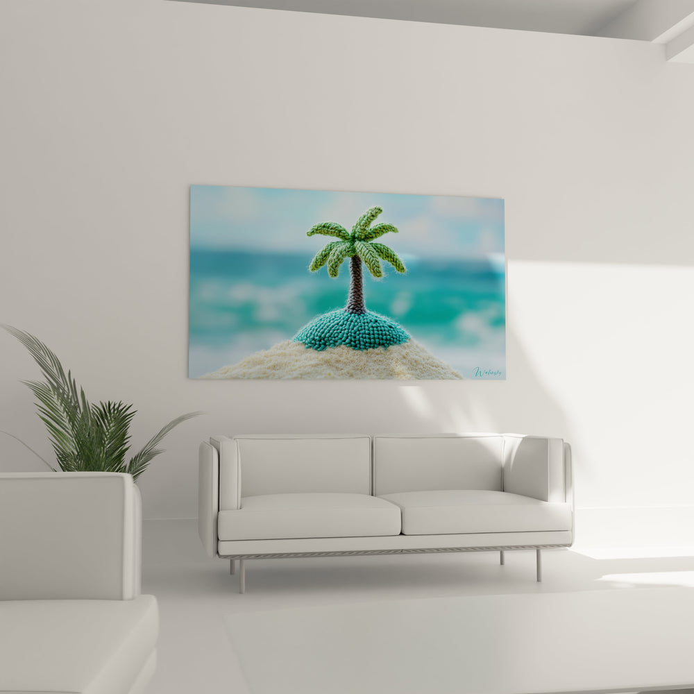 Découvrez ce tableau palmier crocheté exceptionnel qui allie artisanat textile et représentation tropicale avec une finesse remarquable. Cette œuvre représente un palmier minutieusement crocheté émergeant d'une petite île de sable, posée sur un lagon turquoise. La composition centrée offre une symétrie parfaite qui attire immédiatement le regard vers ce microcosme tropical. Ce tableau palmier crocheté miniature se distingue par sa technique textile tridimensionnelle qui crée un véritable relief, donnant vie à cette scène paradisiaque avec une authenticité surprenante.