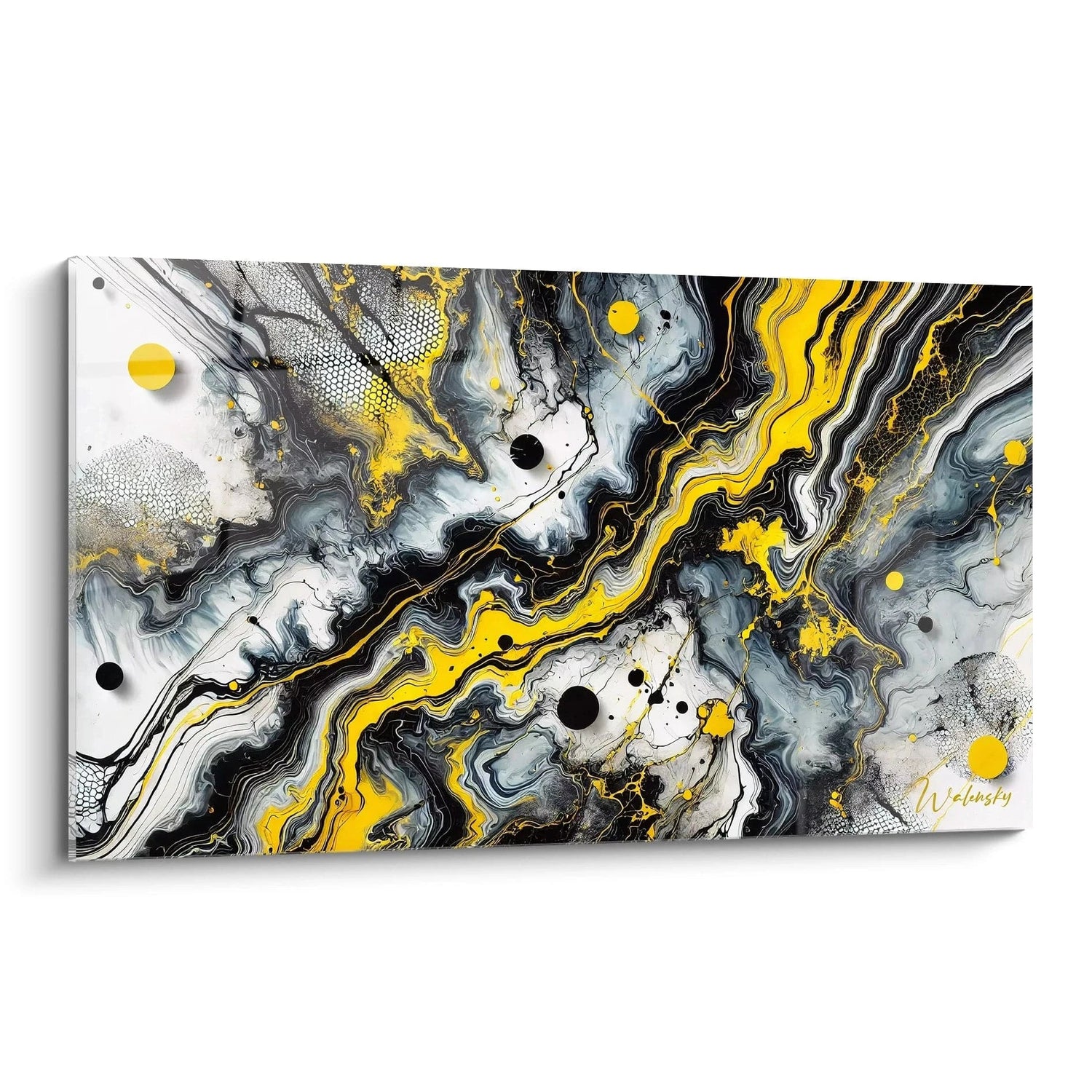 Ce tableau est une véritable symphonie visuelle où le noir profond rencontre des éclats de jaune solaire, traversés par des touches blanches éclatantes. Chaque courbe fluide et chaque dégradé d’époxy racontent une histoire – celle d’une énergie brute en mouvement, parfois calme, parfois intense, toujours élégante.
