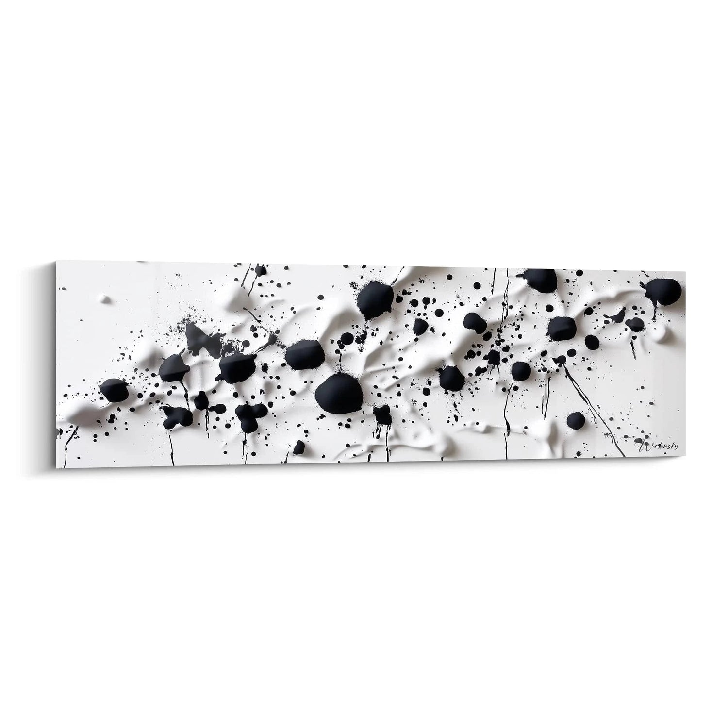 La composition de ce tableau éclaboussures noir blanc suit une répartition équilibrée des masses visuelles sur l'ensemble de la surface. Les projections principales se concentrent dans la partie centrale et supérieure, créant un point focal naturel. Les tableau éclaboussures expressives s'étendent horizontalement, suivant le format panoramique de l'œuvre. L'espace négatif blanc joue un rôle crucial en permettant aux taches noires de respirer et de créer des contrastes saisissants. Cette art mural éclaboussures utilise intelligemment la tension entre vide et plein pour créer un équilibre visuel parfait.