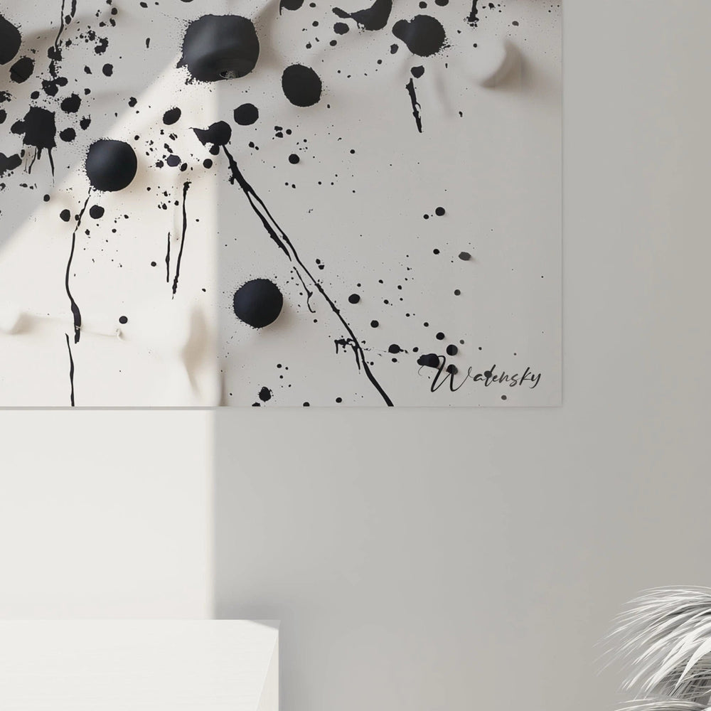 Ce tableau éclaboussures présente une composition abstraite saisissante où dominent les projections noires sur un fond blanc immaculé. L'œuvre révèle une gestuelle spontanée et énergique, caractérisée par des taches de diverses tailles qui semblent avoir été projetées avec force sur la surface. Les tableau éclaboussures abstraites créent un mouvement dynamique qui captive immédiatement le regard. Cette décoration murale éclaboussures évoque la liberté créative et l'expression pure de l'émotion artistique à travers sa technique de projection libre.