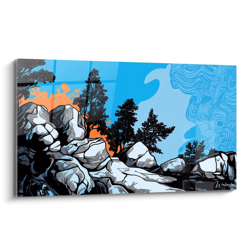 En contemplant cette crĂ©ation, vous sentez presque la douce fraĂźcheur du vent parcourir les branches, tandis que le ciel danse en volutes hypnotiques, mĂȘlant des nuances profondes de bleu Ă un soleil couchant vibrant. Les formes rigoureuses des rochers sâopposent Ă la lĂ©gĂšretĂ© aĂ©rienne, crĂ©ant un Ă©quilibre fascinant qui capte le regard et apaise lâĂąme.
