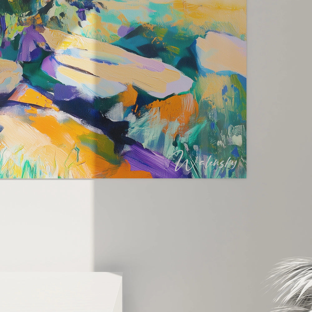 Chaque dĂ©tail de ce tableau est pensĂ© pour Ă©veiller vos sens. Le violet profond des ombres, le vert intense de la vĂ©gĂ©tation et lâorange chaleureux des reflets lumineux crĂ©ent une palette captivante. Ces teintes sâharmonisent dans un jeu de contrastes dynamiques et de textures expressives, qui donnent vie Ă chaque Ă©lĂ©ment. Vous pourrez presque sentir la brise lĂ©gĂšre, entendre le souffle du vent dans les feuilles, et ressentir la douceur de cette lumiĂšre naturelle qui traverse la scĂšne.