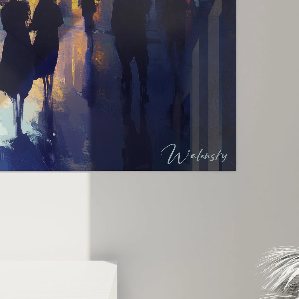 Ce tableau ne se contente pas de figer un paysage : il vous plonge au cœur d’une métropole en mouvement, où silhouettes floues et reflets chatoyants sur les pavés racontent une histoire d’agitation mêlée de douceur. Le passage subtil du jour à la nuit est ici représenté par un jeu maîtrisé entre ombres et lumières, qui invite à la contemplation et à l’évasion.