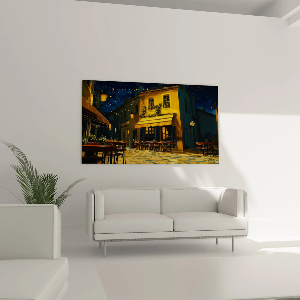 Ce tableau capte la magie d’une soirée provençale avec ses ruelles animées par des lanternes dorées et son ciel bleu profond. Les contrastes de lumière créent une ambiance chaleureuse et intimiste, où l’éclat des façades jaunes semble presque palpiter, tandis que la nuit marine caresse chaque détail avec douceur. On imagine aisément la sensation agréable d’une brise légère, un murmure de conversation au loin, et le cliquetis des verres délicatement posés.