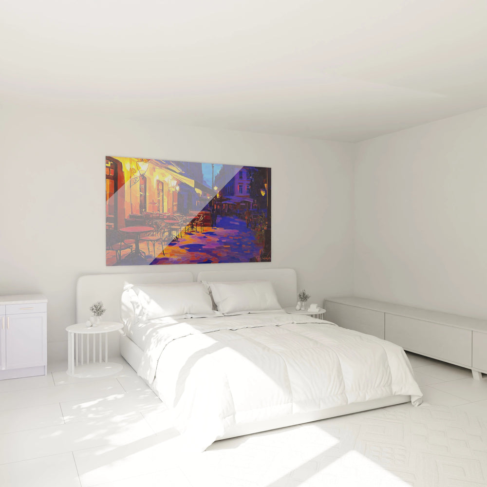 Les nuances profondes de bleu marine côtoient des éclats chauds de jaune incandescent, illustrant avec élégance le contraste subtil qui donne vie à cette scène urbaine nocturne. Les contours tourbillonnants et les textures en relief offrent une sensation presque tangible, comme si vous pouviez sentir la brise fraîche de la nuit mêlée à la chaleur apaisante du lieu.