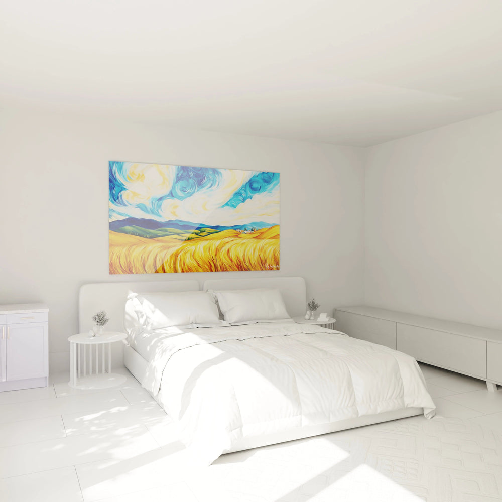 Ce tableau tire son inspiration des paysages emblématiques immortalisés par Vincent Van Gogh, alliant la richesse émotionnelle du post-impressionnisme à une sensualité visuelle rare. Il célèbre le lien fragile entre ciel et terre à travers un jeu de textures et de couleurs qui réveillent vos sens et éveillent votre âme artistique.