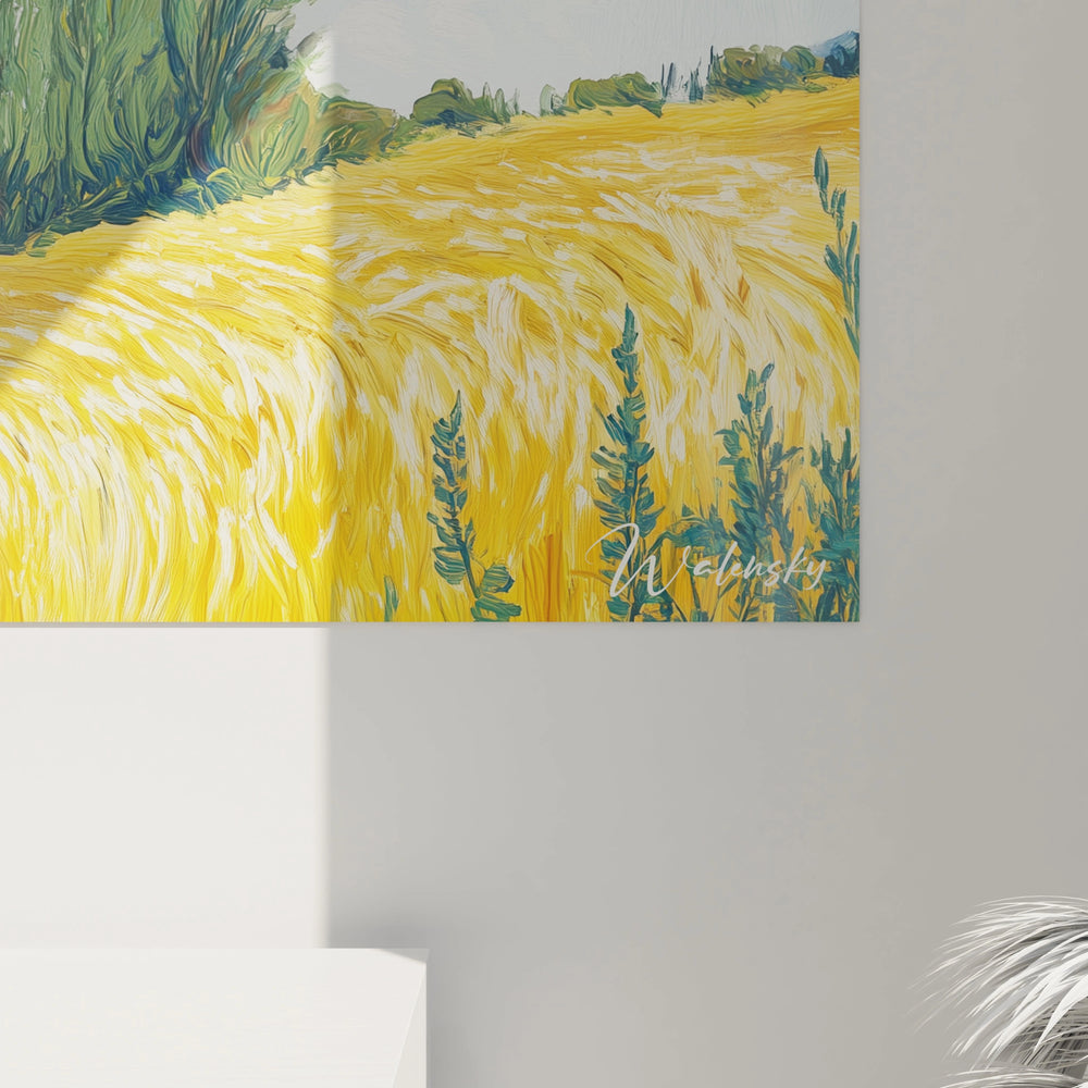 Ce tableau transcende la simple représentation : il vous invite à ressentir la douce caresse du vent sur votre peau, à entendre le murmure discret des champs ondulants et à goûter la sérénité profonde d’un instant suspendu. Parfaitement équilibré entre mouvement et calme, il crée une ambiance chaleureuse et raffinée qui sublime vos espaces de vie.