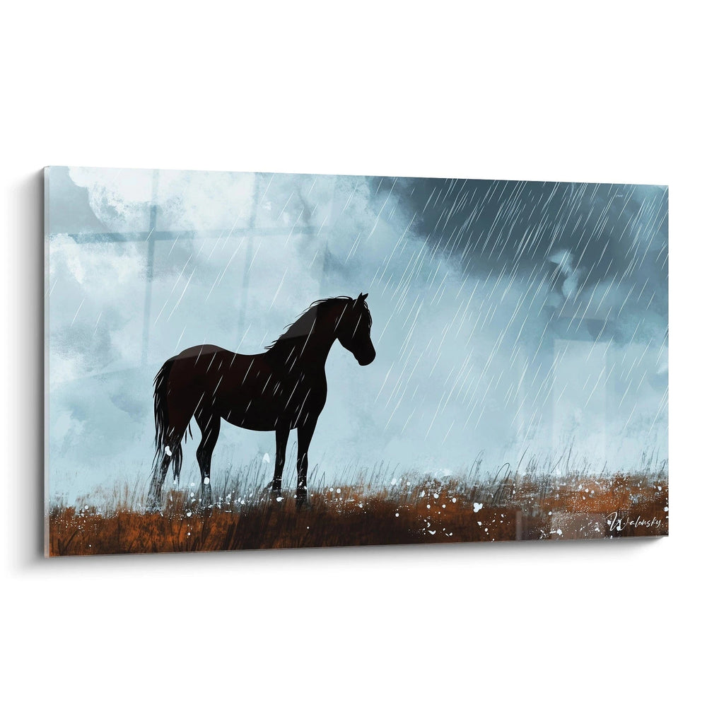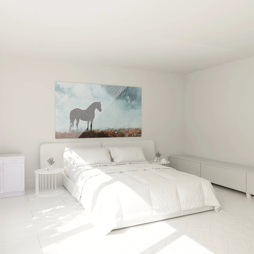 Conçu pour éveiller une ambiance singulière dans votre intérieur, ce tableau capture l’élégance sauvage et la résilience face aux éléments. La silhouette du cheval, magnifiquement cernée par un ciel tourmenté, incarne cette force majestueuse qui perdure malgré la tempête. Vous percevez presque les gouttes de pluie s’abattre, le vent glacial qui s’engouffre entre les fougères tremblantes… Une immersion sensorielle où chaque regard nourrit votre esprit par le mystère et la tension dramatique.