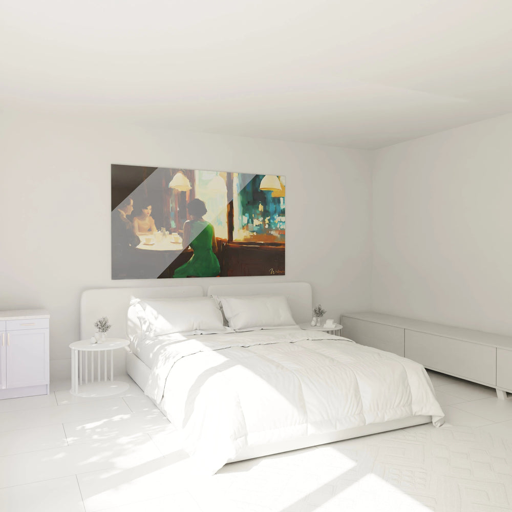 Né d’une inspiration profonde lors d’une promenade nocturne, ce tableau est une fenêtre ouverte sur une intimité partagée et pourtant solitaire, reflet sublime de nos moments de silence en présence des autres. Plus qu’une simple représentation, il incarne le paradoxe humain, magnifié par un style réaliste qui fait vibrer chaque nuance et chaque détail.
