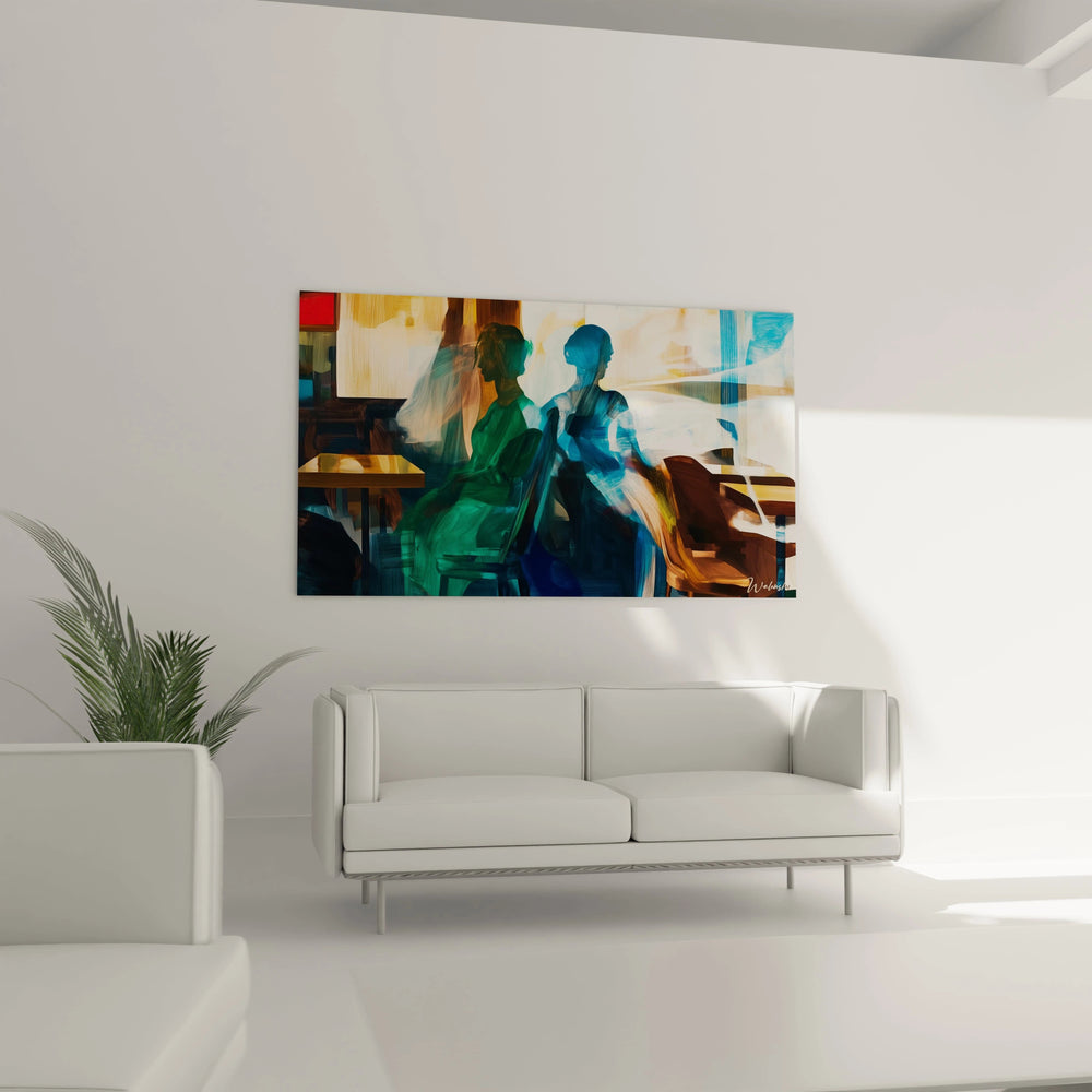 Ce tableau déploie un univers où les silhouettes s’entrelacent délicatement sous une lumière diffuse, évoquant à la fois l’intimité d’un café et la solitude partagée des grandes villes. Chaque contour, légèrement estompé, invite à une douce rêverie, comme si le temps ralentissait autour de vous. Imaginez-vous face à cette toile : les nuances riches de vert émeraude, bleu marine et ocre éclairent votre pièce, créant une atmosphère à la fois apaisante et stimulante.