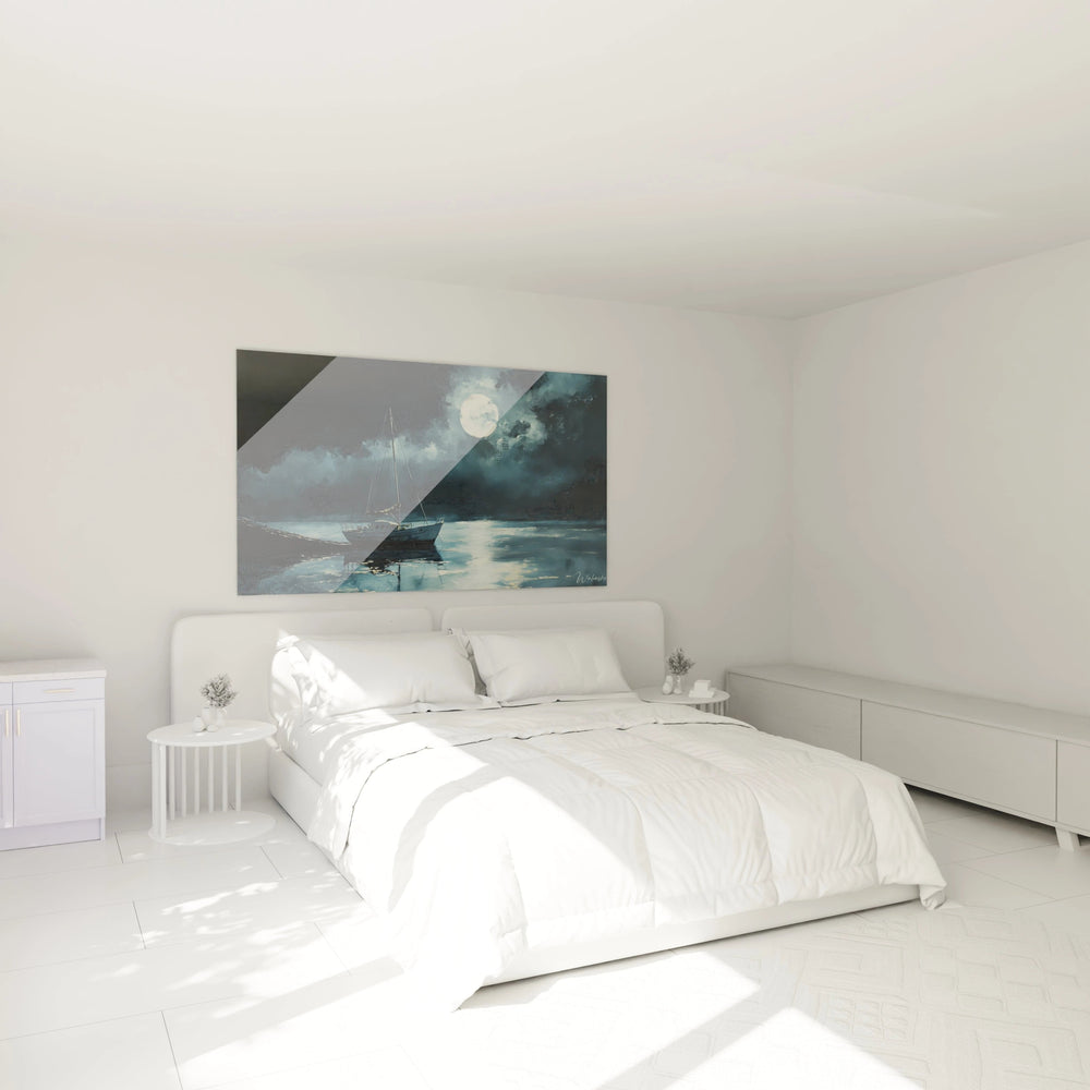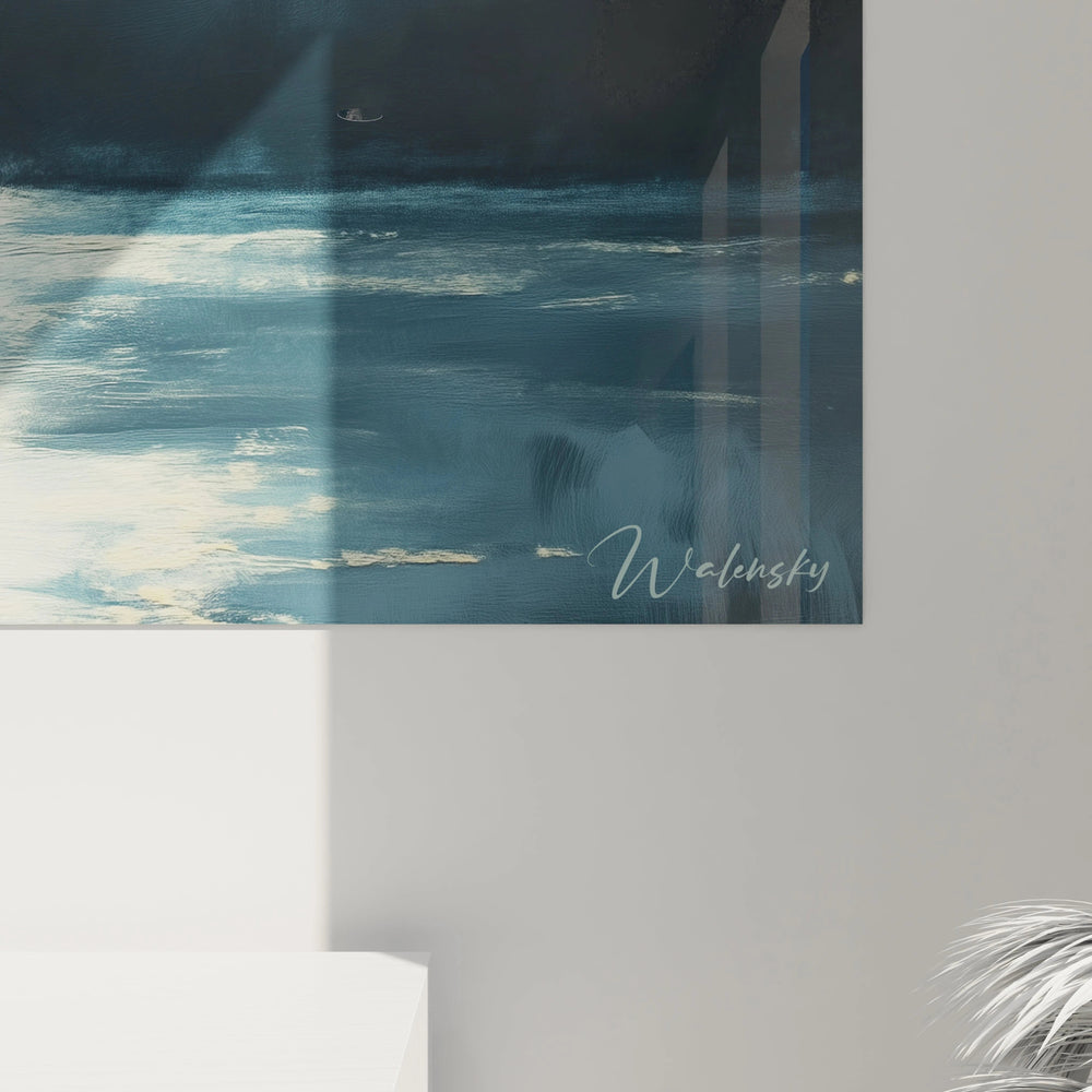 Chaque regard posé sur cette œuvre vous plonge dans une atmosphère où se mêlent sérénité et mystère. Les nuances profondes de bleu nuit, de gris argenté et de noir se déploient avec une délicatesse raffinée, évoquant la danse subtile entre la lumière lunaire et les ombres marines. Ce contraste vibrant invite à la contemplation, suscitant une émotion riche qui éveille autant l’imaginaire que la sérénité.