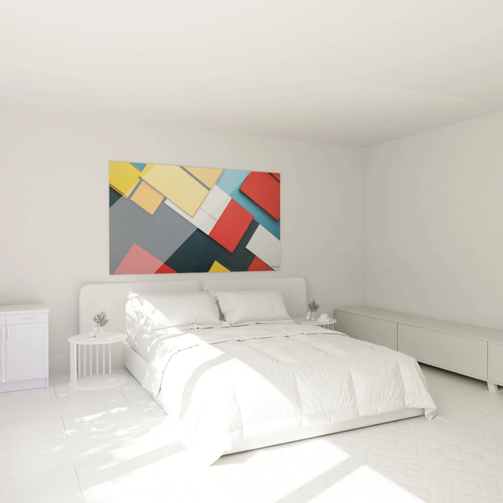 Imaginé pour éveiller vos sens, ce tableau mêle la pureté géométrique à des couleurs primaires éclatantes : un rouge intense, un bleu profond et un jaune lumineux, qui se répondent dans une composition soigneusement orchestrée. Chaque rectangle et chaque ligne sont pensés pour créer un profond contraste tout en maintenant un équilibre subtil, offrant ainsi une dynamique intérieure qui capte l’attention et nourrit l’âme.