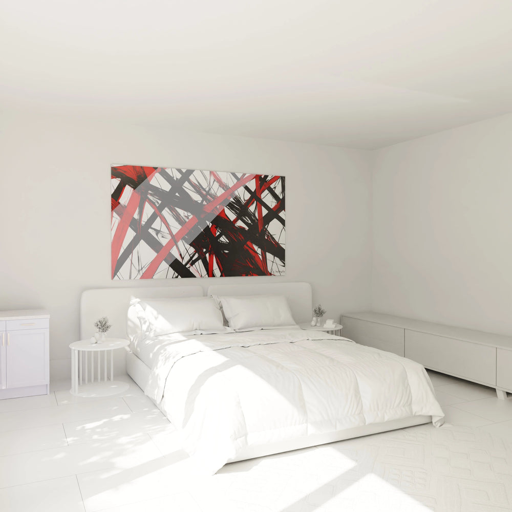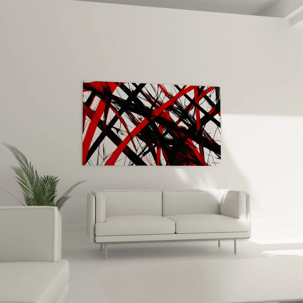 Dans cette composition, chaque trait noir se pose avec une force maîtrisée, guidant votre regard à travers un jeu d’équilibre entre calme et tension. Les touches rouges éclatantes viennent dynamiser cet univers minimaliste, insufflant une passion palpable qui électrise l’atmosphère.