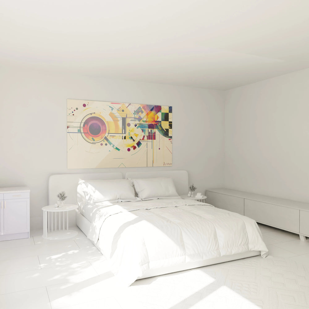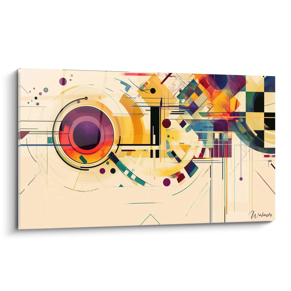 Les couleurs ont été choisies avec un soin tout particulier pour éveiller vos sens. Le jaune lumineux, le violet profond et le rouge intense dialoguent avec des touches subtiles de bleu et de vert, créant une palette riche et équilibrée. Les dégradés précis et les formes géométriques s’entrelacent avec grâce, apportant à la fois dynamisme et sérénité. Chaque regard porté sur cette pièce vous invite à un voyage visuel captivant, qui stimule l'imagination.