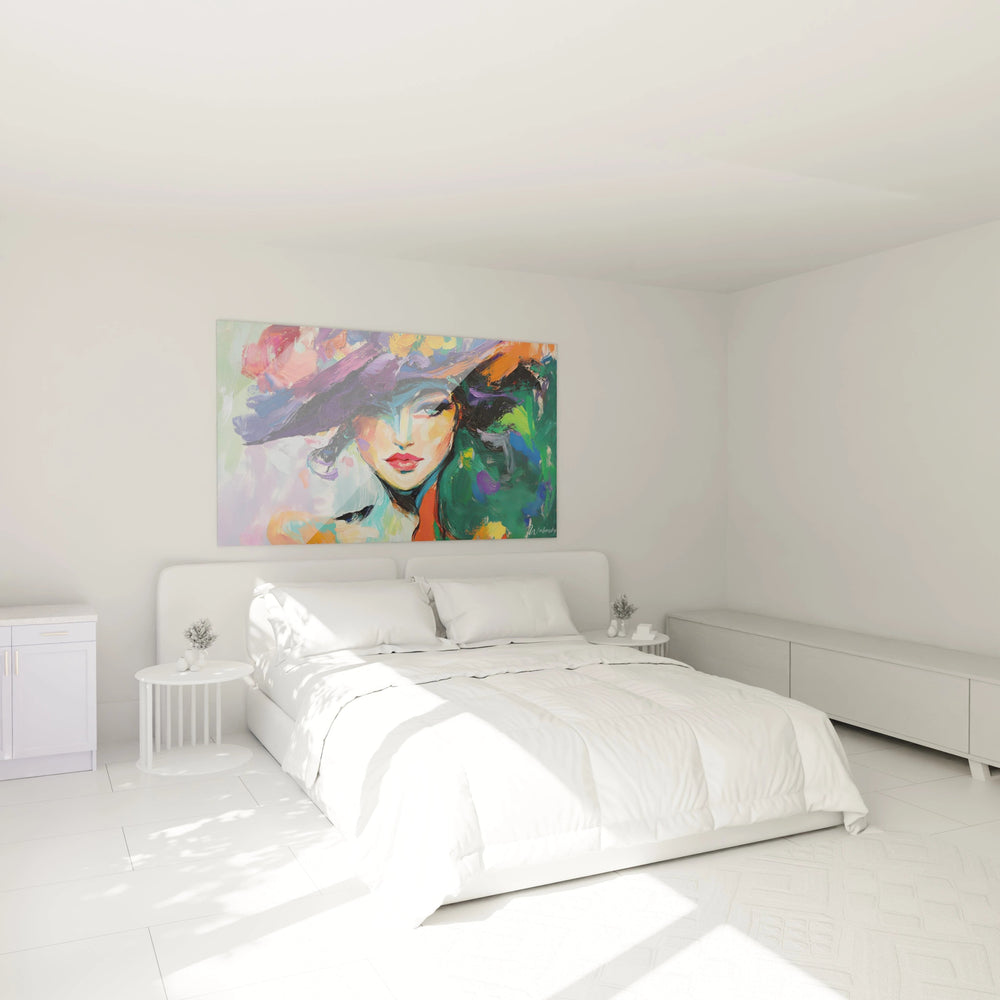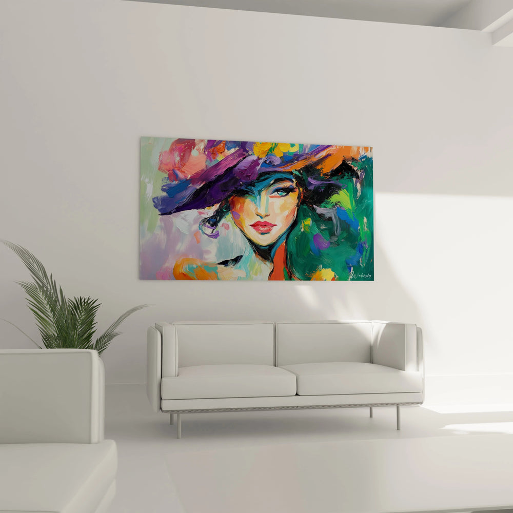 Au cœur de cette création, se trouve une histoire racontée à travers chaque nuance et chaque trait. La silhouette féminine, coiffée d’un chapeau profond violet, rayonne d’une passion subtile et d’une force douce. Le rouge éclatant qui souligne les lèvres captive le regard et accroche l’émotion. Le fond vert émeraude, à la fois apaisant et puissant, enveloppe la scène d’un souffle de vie.