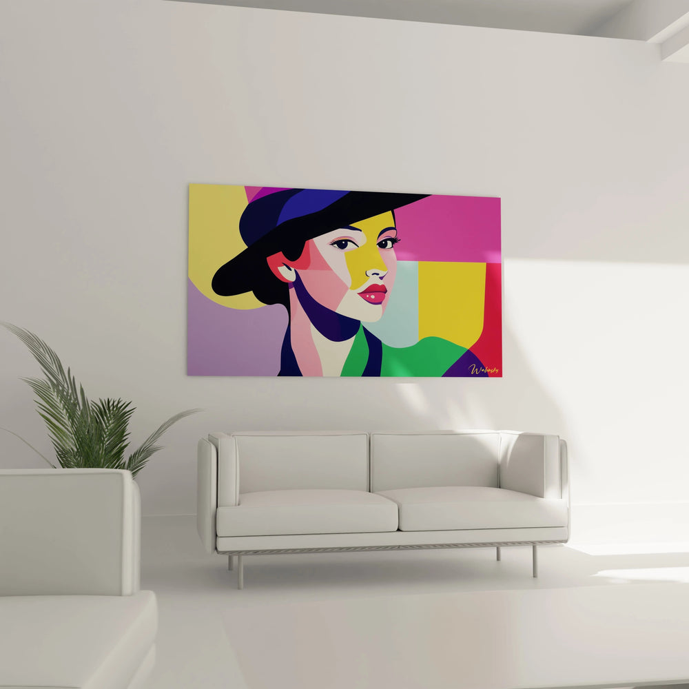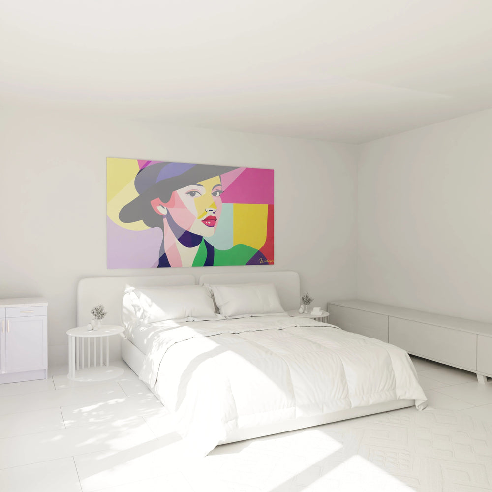 Inspiré par la lumière vive du Sud de la France et les portraits emblématiques de l’artiste, ce tableau déploie des aplats riches en violet, jaune et rose qui capturent tout à la fois la fraîcheur et l’énergie. Les formes géométriques nettes enveloppent un visage stylisé, presque iconique, dont l’expression se détache avec intensité. Cette composition offre un équilibre parfait entre simplicité visuelle et dynamisme éclatant.