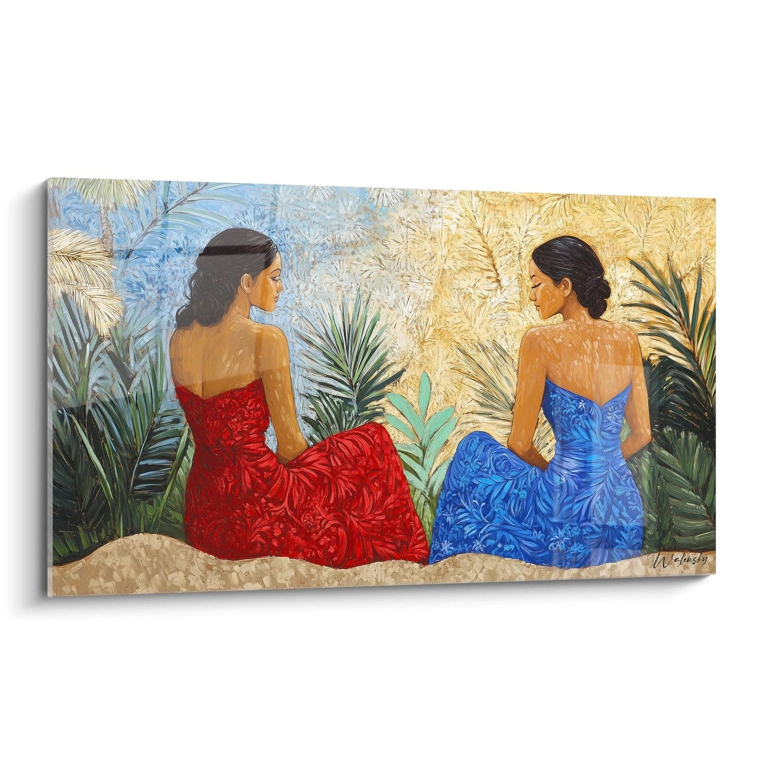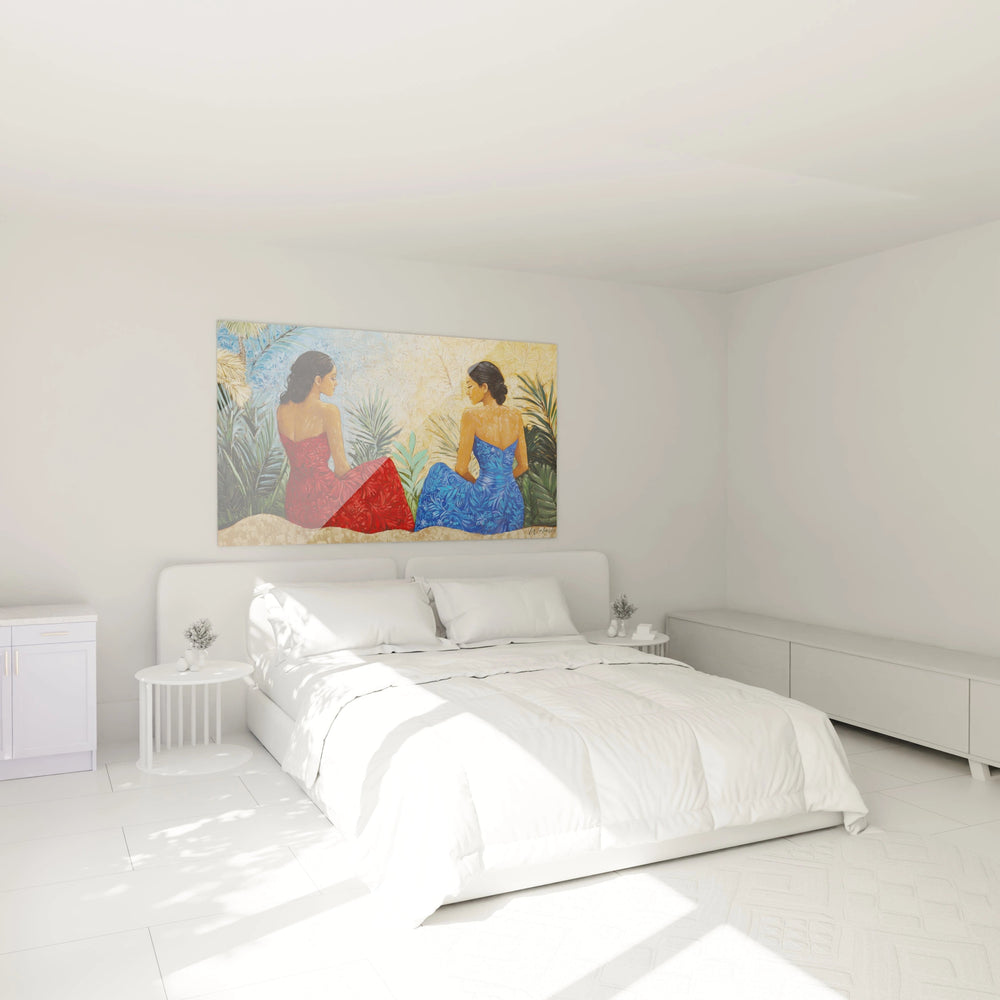 Les deux figures féminines, baignées d’une lumière douce, évoquent une quiétude profonde, invite à la méditation et à l’évasion. Leurs vêtements aux teintes lumineuses – rouge passion, bleu apaisant, et beige chaleureux – s’accordent à merveille avec le décor végétal luxuriant qui les entoure, recréant une atmosphère à la fois vibrante et reposante. Ce tableau est une ode aux instants suspendus, où le calme intérieur trouve sa place au sein d’un monde vibrant et coloré.