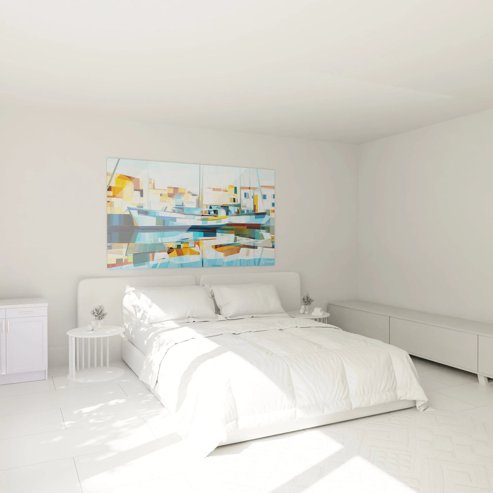 Au cœur de cette œuvre, le bleu profond des bateaux se mêle au jaune doré des façades baignées de soleil et au blanc lumineux des voiles flottant dans un ciel clair. Ces teintes, soigneusement harmonisées, évoquent immédiatement la douce chaleur des ports méditerranéens, où l’ombre et la lumière se combinent pour transformer chaque instant en une expérience sensorielle. Chaque regard posé sur ce tableau révèle une géométrie fluide où les formes épurées des voiliers et des bâtiments s’animent, créant un sentiment de mouvement et de transparence qui capte l’essence même de la mer et du port.